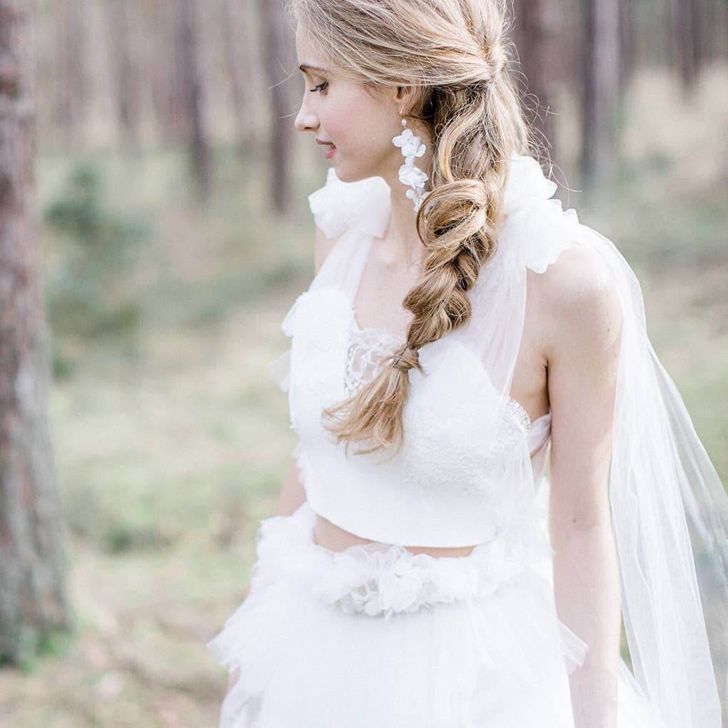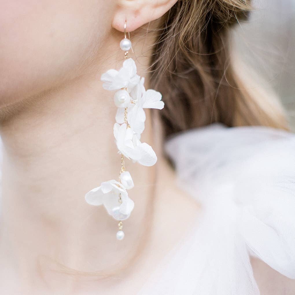 Como un grupo de flores que cuelgan de la oreja, los pendientes Elsa combinan la delicadeza de los pétalos de hortensia estabilizados con perlas. Los rizos de Elsa se verán geniales con un vestido de corte bajo y un cabello ligeramente elevado para resaltarlos. Estos pendientes se han diseñado con cierres para orejas perforadas, pero se pueden enganchar a pedido.