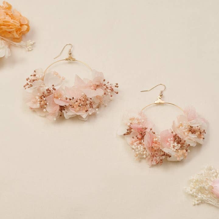 Iconico, el aro floral es el par de pendientes bohemios y elegantes por excelencia para llevar tanto para tu boda como para cualquier ocasión bonita. Para la colección Les Croonnes de Victoire x Louise Misha, los colores han sido revisados para aportar un toque suave y colorido gracias a los diferentes tonos de color de las hortensias estabilizadas y la gypsophila. Para tu boda, es el accesorio ideal para darle un aspecto a tu atuendo. Como invitado o en la vida cotidiana, te dará un toque romántico y femenino. Estos pendientes se pueden montar en clips para orejas sin perforar.