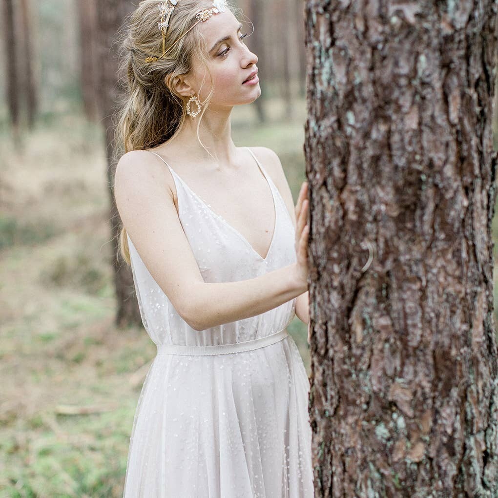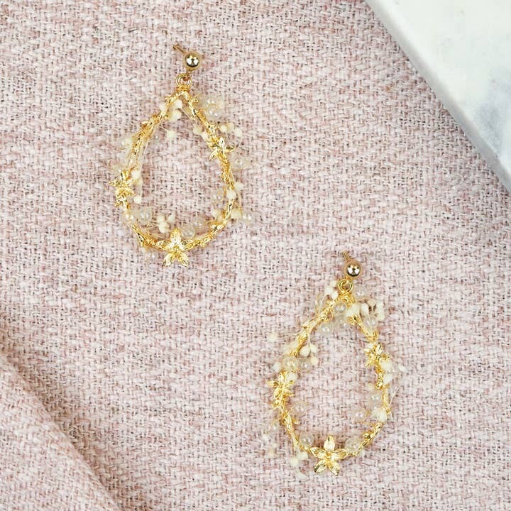 La delicadeza y la delicadeza caracterizan estos bonitos pendientes decorados con pequeñas cuentas de vidrio soplado y flores de gypsophila. Estos pendientes de flores son perfectos para vestir un atuendo de novia, pero también se pueden llevar para dar estilo a un atuendo diario. Montados en tachuelas para orejas perforadas, los pendientes Salomé también se pueden enganchar a pedido.