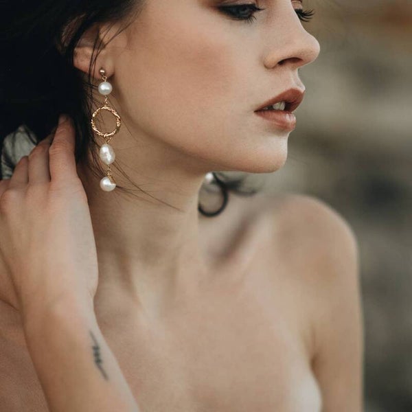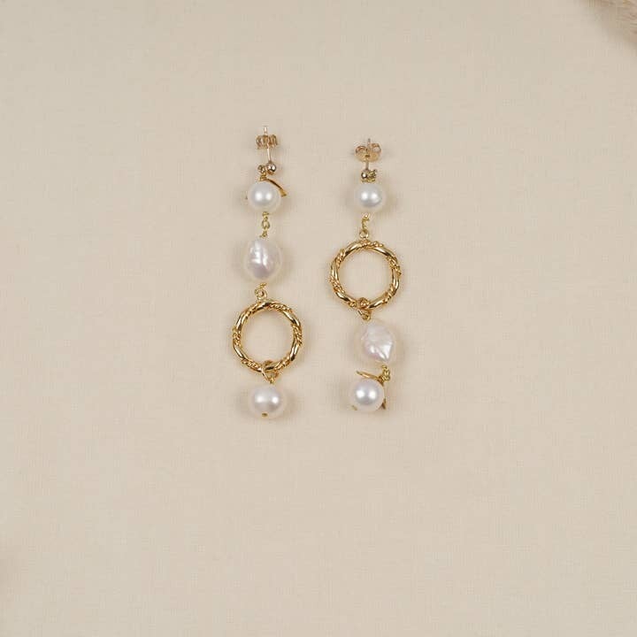 Echa un par de pendientes sencillos y elegantes con nuestros pendientes Nausicaa adornados con un delicado anillo de cuerda chapado en oro y perlas de agua dulce. Una pareja moderna que juega con la asimetría para sublimar un look nupcial minimalista y moderno.