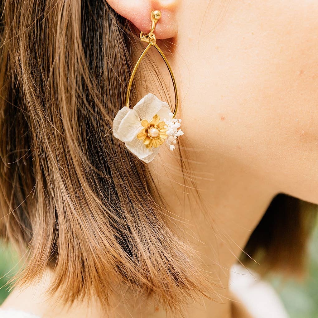 La delicadeza y la delicadeza son el lema de nuestros pendientes Amanda. Un óvalo de metal chapado en oro realzado por una flor de hortensia blanca estabilizada, pequeñas flores de gypsophila y una pequeña flor de metal adornada con una perla componen estos pendientes minimalistas y femeninos. Llévalo con todos tus bonitos atuendos veraniegos o para una boda. No dudes en combinar los pendientes Amanda con la pinza para el pelo Amanda para tener aún más carácter. Estos pendientes están disponibles en clips bajo petición. Si es necesario, especifíquelo respondiendo al correo electrónico de confirmación automática del pedido.