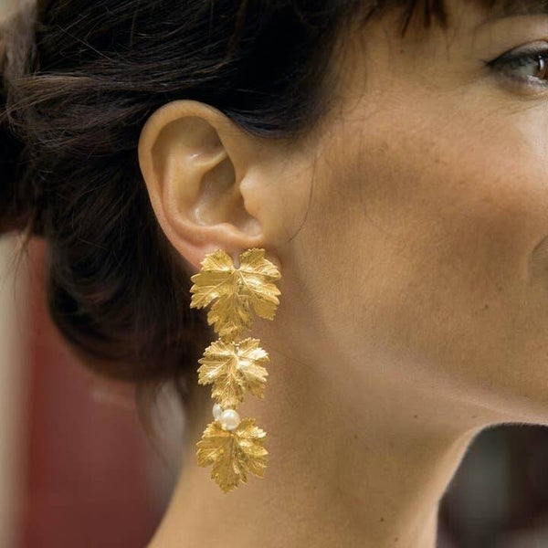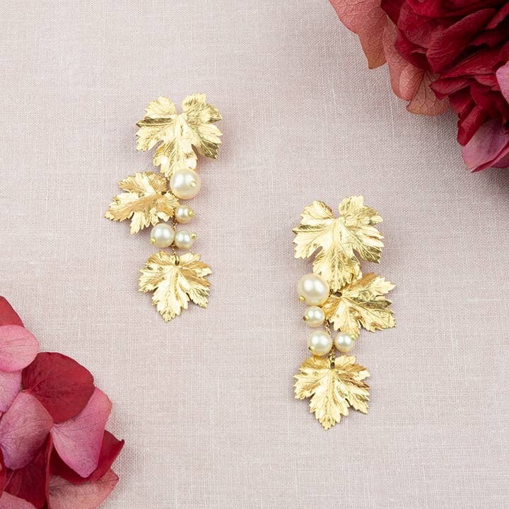 Los pendientes Montmartre presentan hojas de vid bañadas en oro de diferentes tamaños en cascada. Adornada con delicadas perlas, esta cascada de hojas se ondulará a lo largo del cuello mientras te mueves.