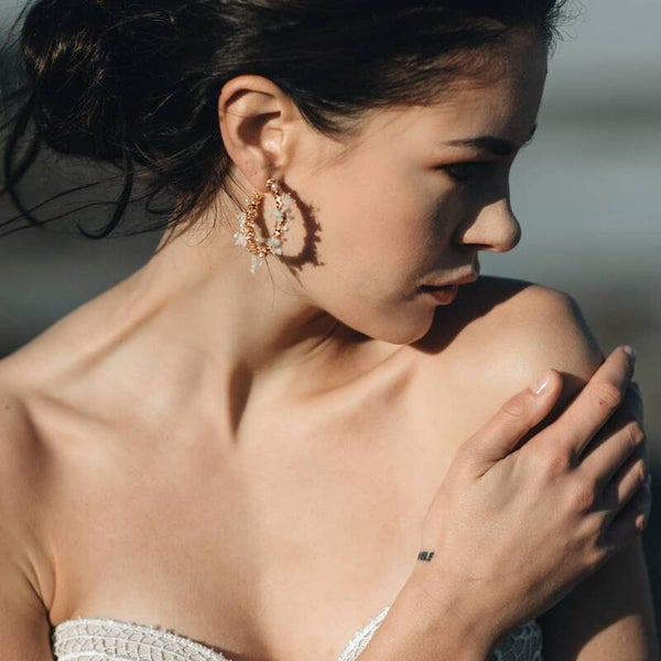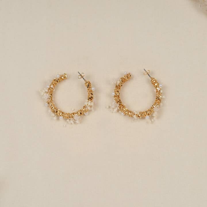 Disponibles en nuestros emblemáticos pendientes Flower, los pendientes Poema consisten en pequeños aretes de aro martillados adornados con gypsophila blanca estabilizada y flores de umbellifer. Muy finos y delicados, los pendientes Poema serán el toque femenino y floral de tu atuendo.