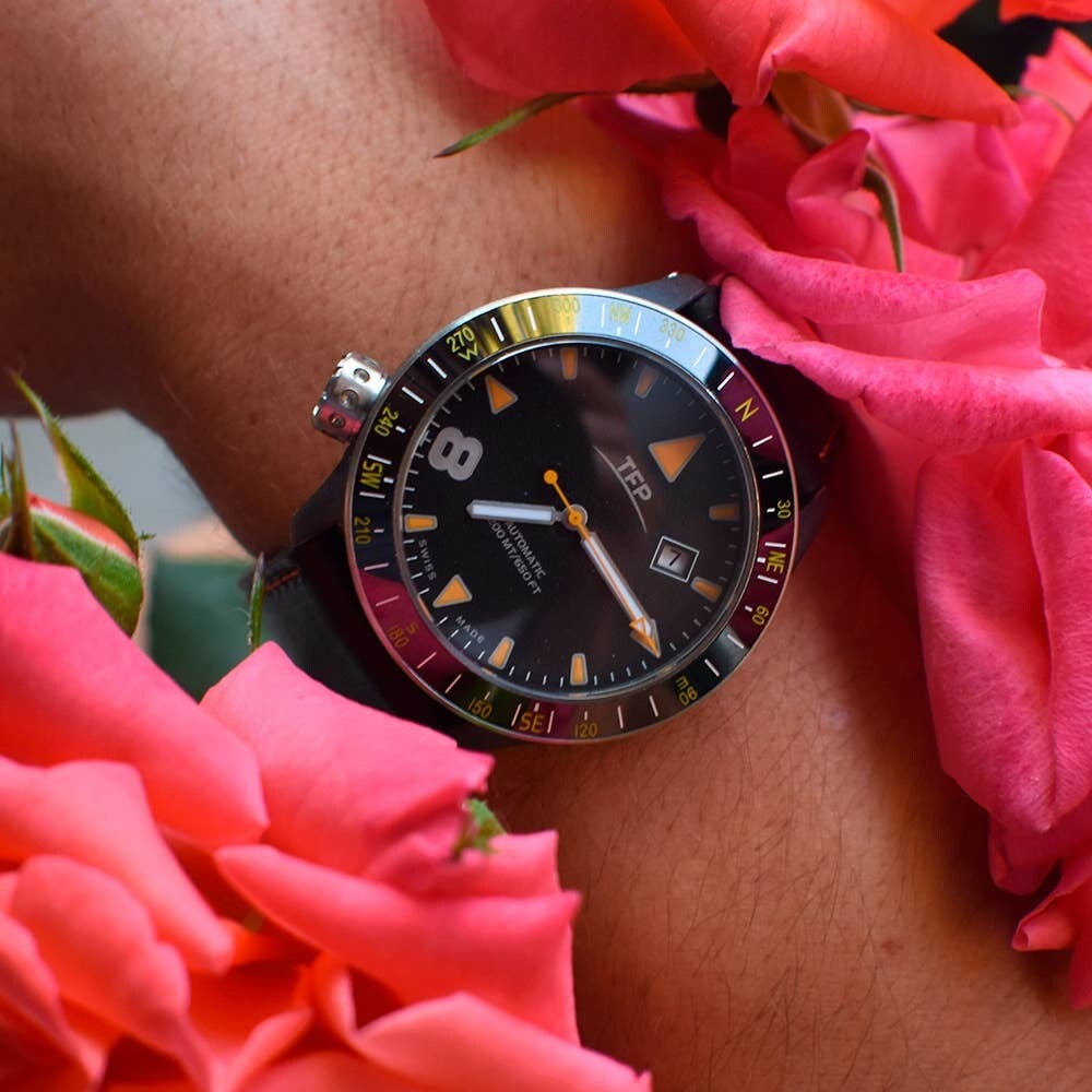 TFP WINDROSE es un reloj de 3 agujas, con bisel de anillo fijo, de cerámica, con caja de acero fundido de 42,5 mm, fondo de caja grabado, cristal de zafiro con doble cúpula.