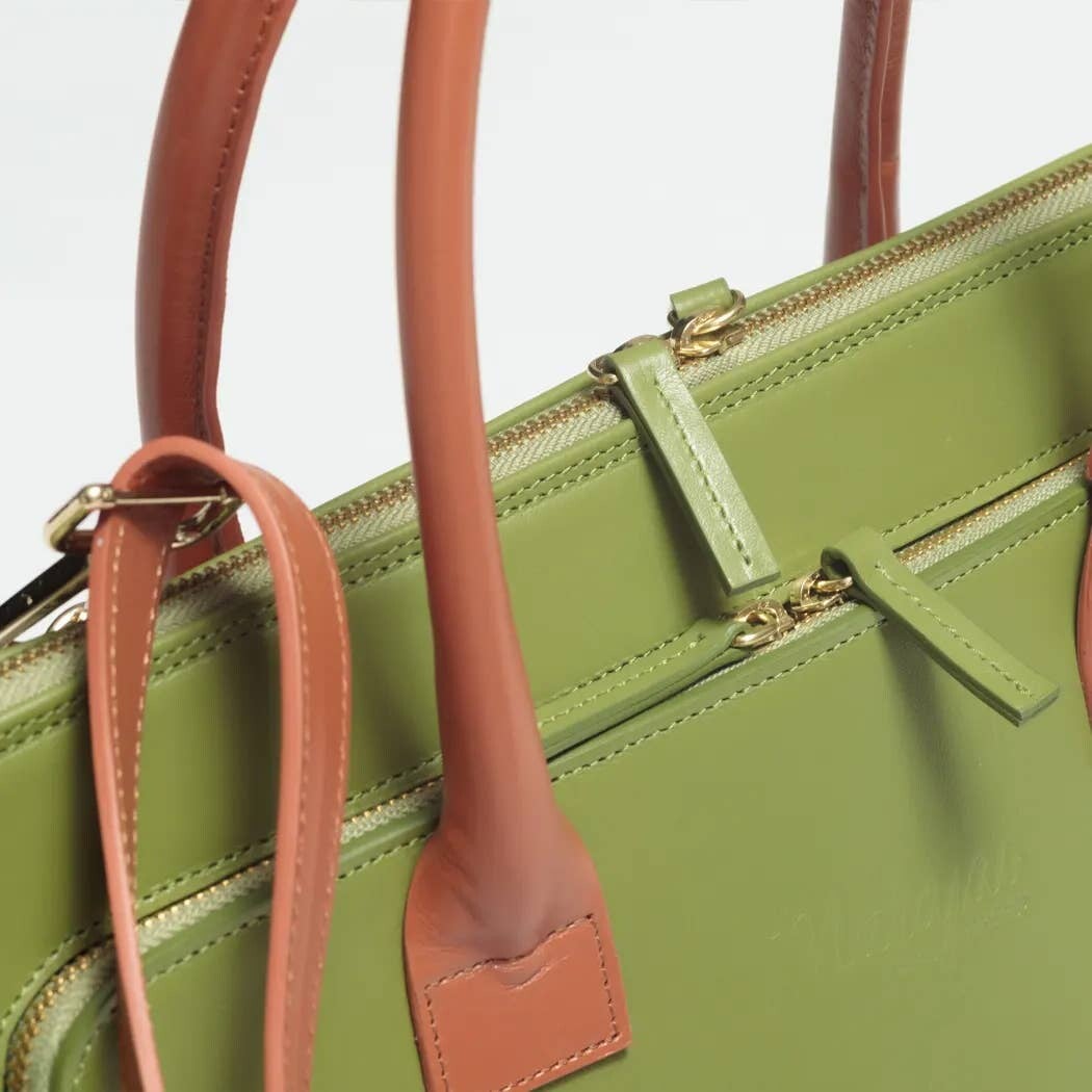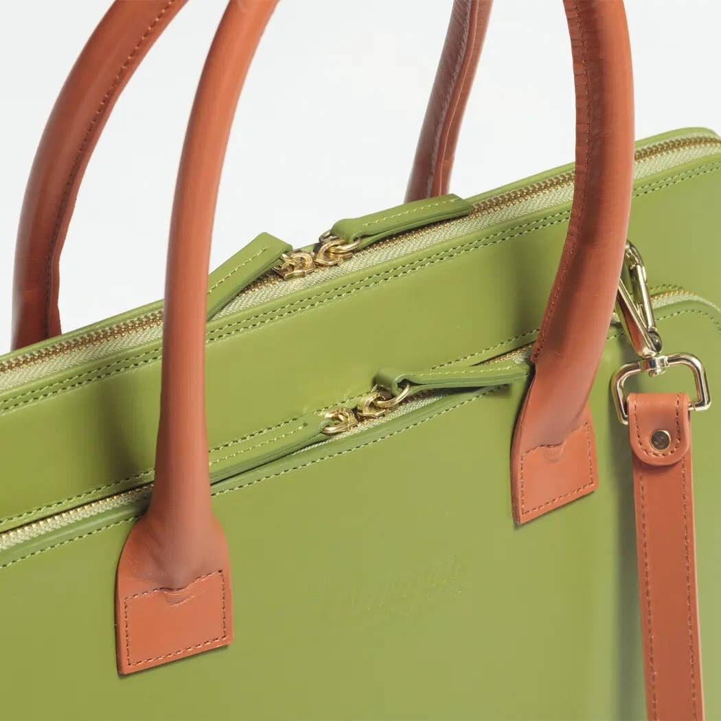 Bolso de tacto suave y muy polivalente en vacuno verde. Ideal para trabajo capacidad para guardar PC, móvil tarjetas su modelo es unisex.