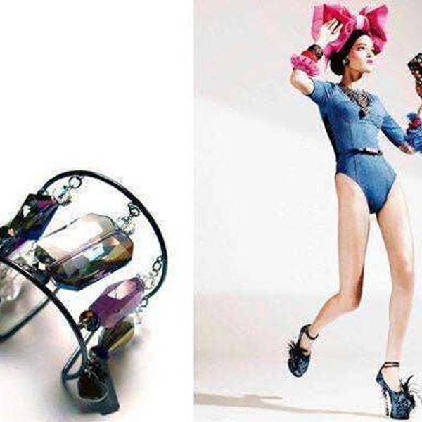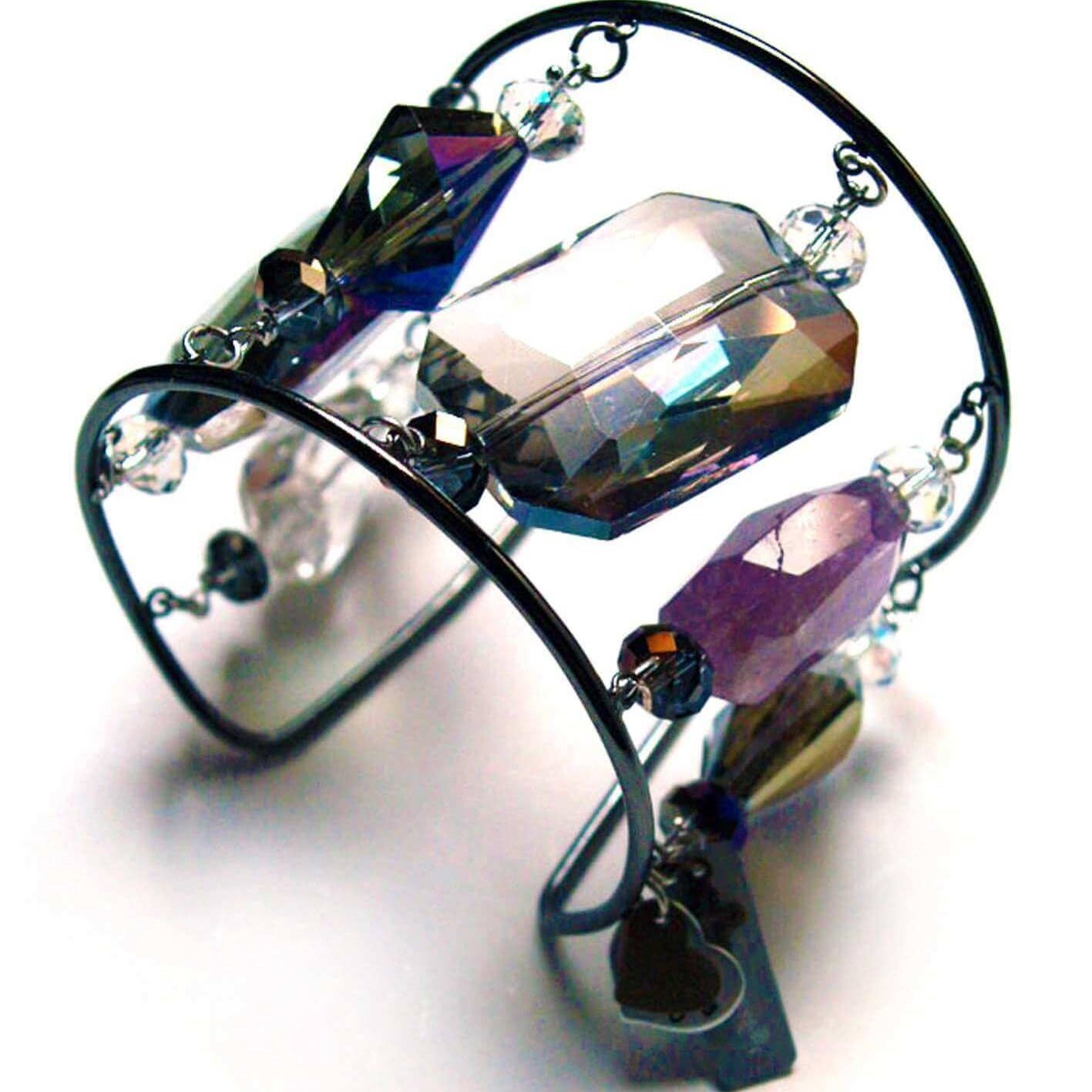 Pulsera realizada con latón bañado en bronce, cristales y piedras semipreciosas naturales. Piedras: cristal de roca y amatista. Barnizado a mano, hipoalergénico y fabricado a mano en Italia.
