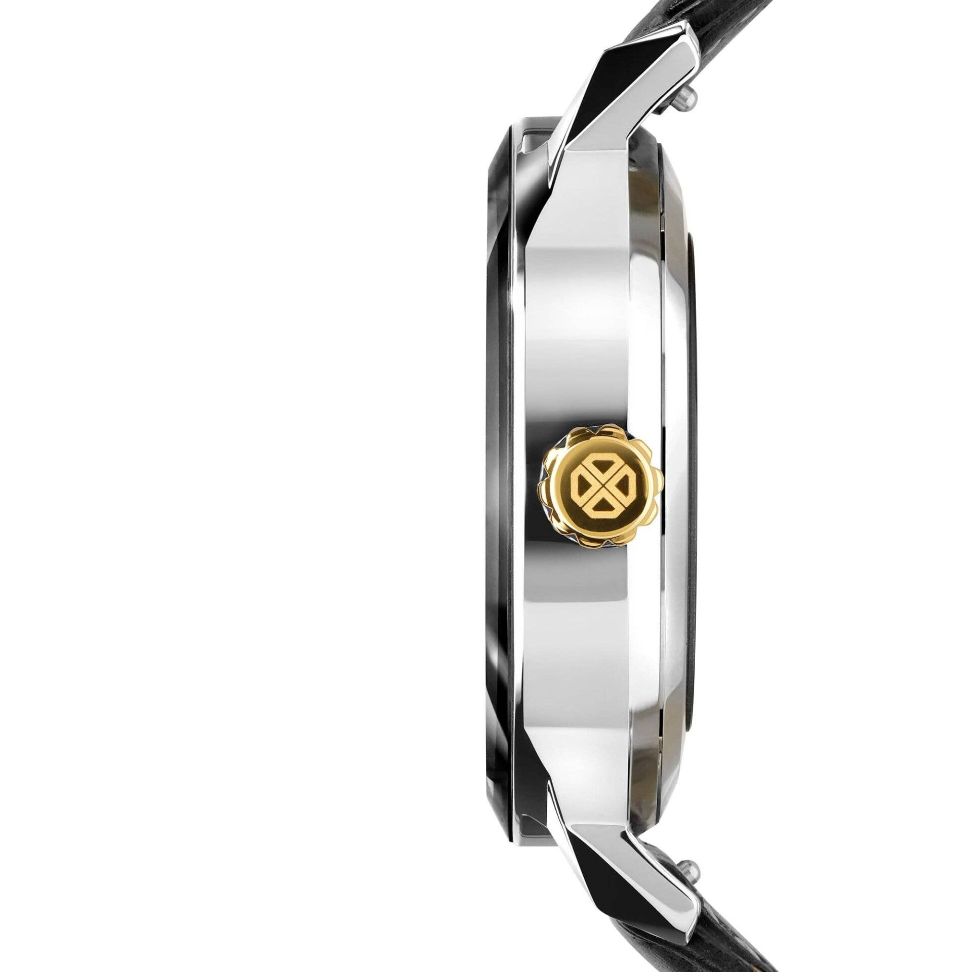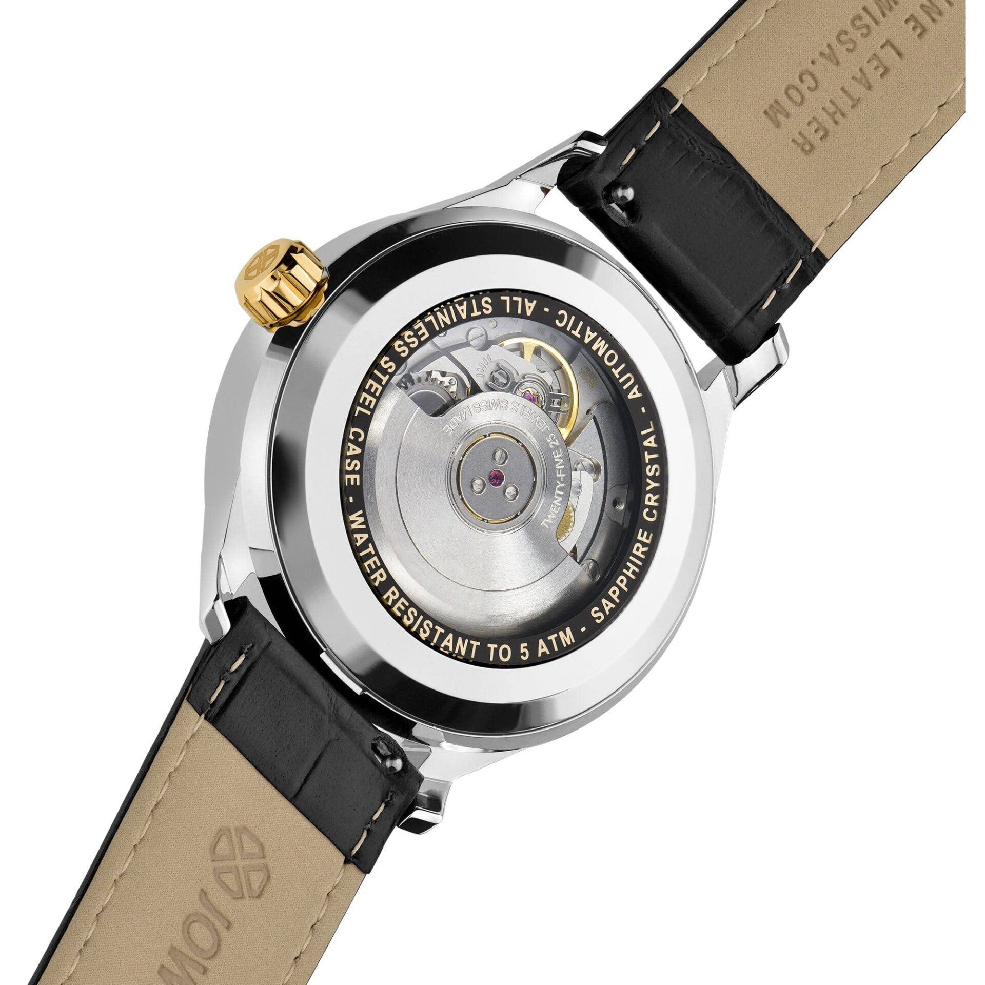 Jowissa presenta diseños vanguardistas con este reloj automático negro-oro para caballero de la colección Virtuo. Gracias a la parte trasera transparente, se puede ver el movimiento mecánico que destaca las complejidades de los relojes Swiss Made. Este reloj de 41 mm con correa de piel de aligátor negra es un reloj de calidad para el uso diario