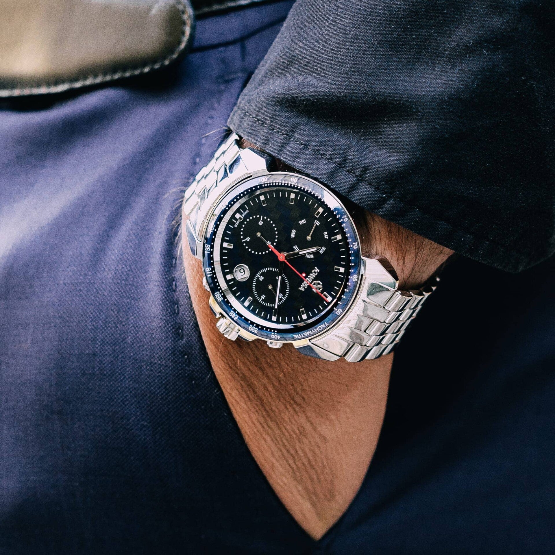 Actualiza tu muñeca con este nuevo cronógrafo azul con un brazalete de acero inoxidable fabricado con altos estándares para una máxima comodidad. Tiene una esfera de fibra de carbono azul y negra que se ve muy bien y está diseñada para durar cualquier aventura. Equipado con una caja de 42 mm e índices minimalistas, es un reloj en el que puede confiar