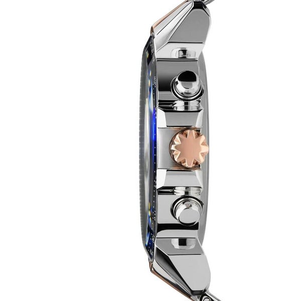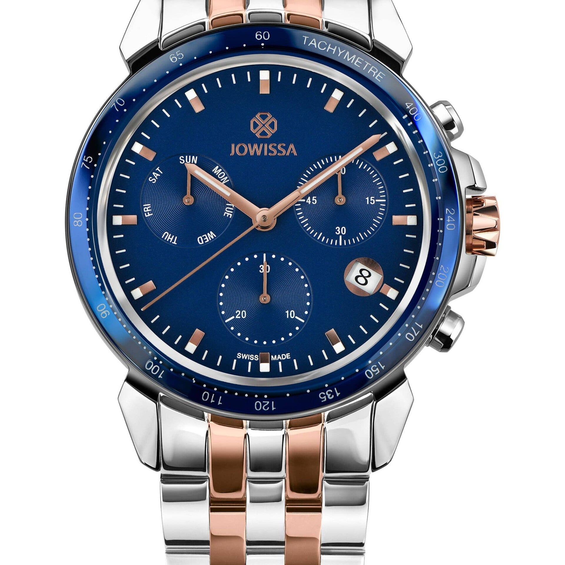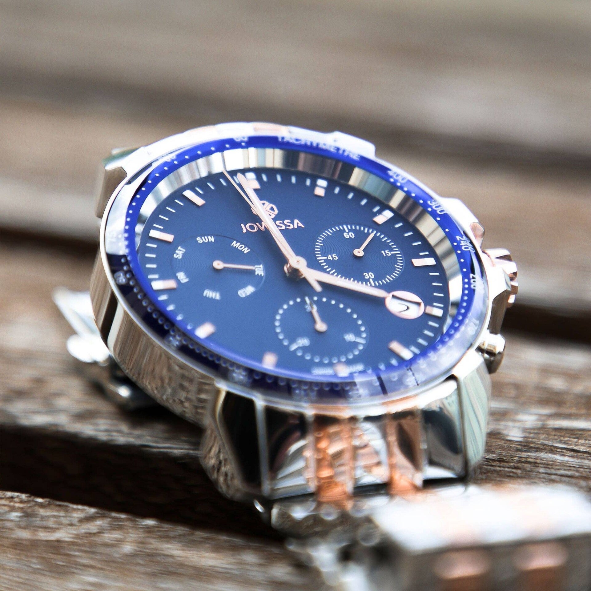LeWy 9 es uno de esos relojes inteligentes pero casuales para hombres que quedan bien en una oficina o en la montaña. Este cronógrafo con caja de 42 mm tiene una esfera azul con subesferas y calendario para obtener más detalles. La pulsera de acero inoxidable recibe una actualización moderna con detalles en oro rosa que también se ven en los índices y la corona
