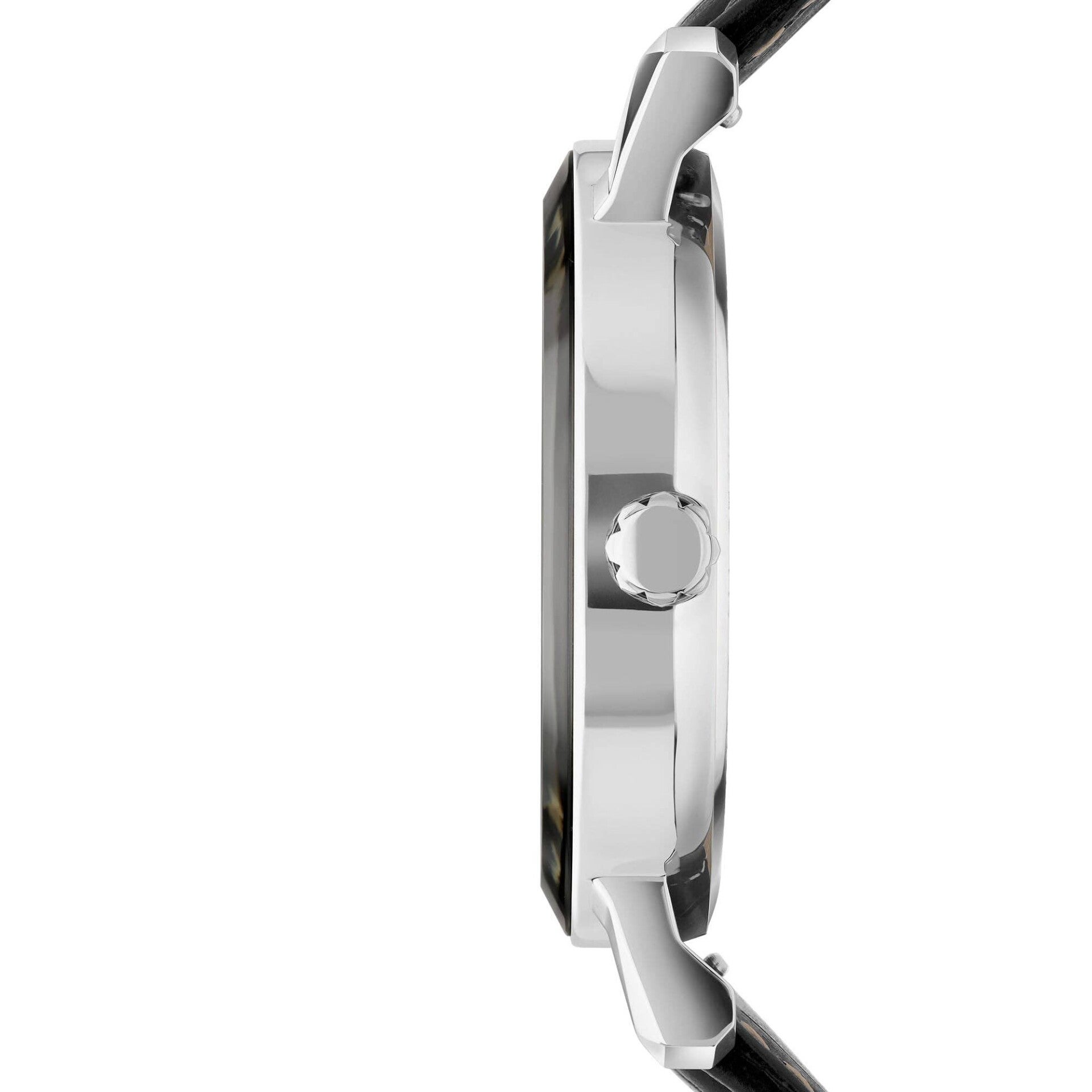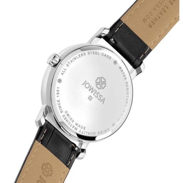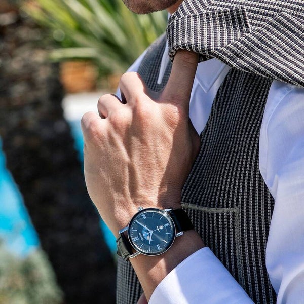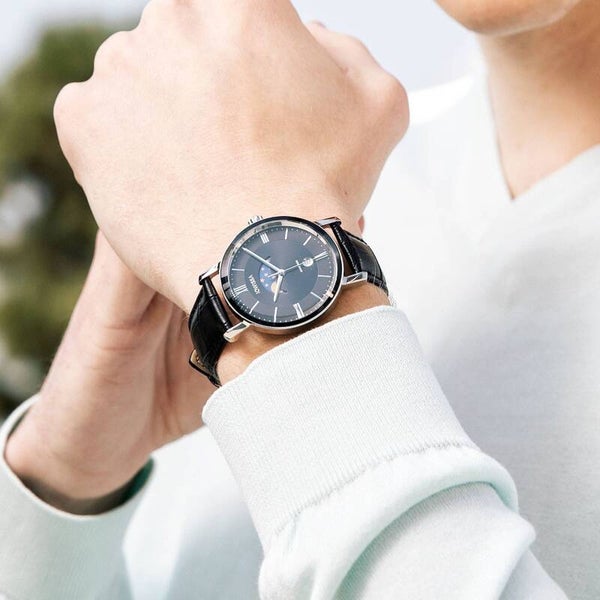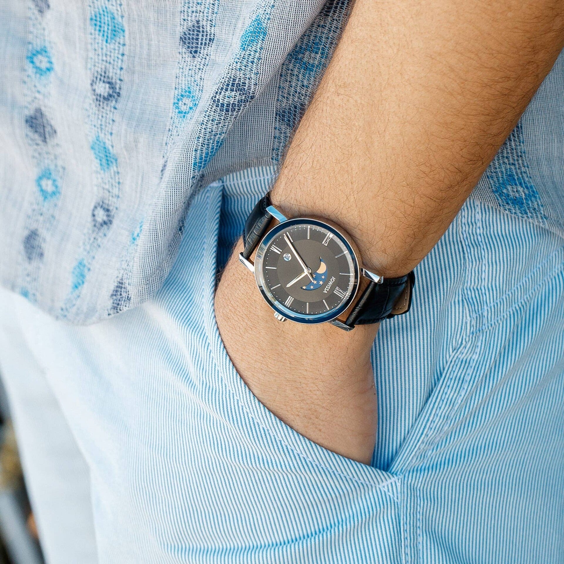 Este reloj de hombre fabricado en Suiza es un reloj robusto que muestra la fase actual de la luna en una esfera negra de rayos de sol. También hay una ventana de fecha para obtener más detalles. El diámetro considerable de 40 mm, los índices plateados y el cristal robusto mejoran el aspecto. La correa de piel de cocodrilo negra suave y elegante logra un acabado elegante