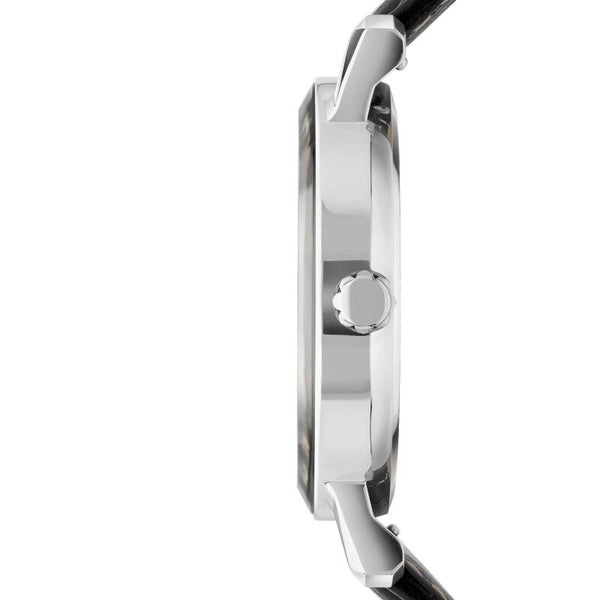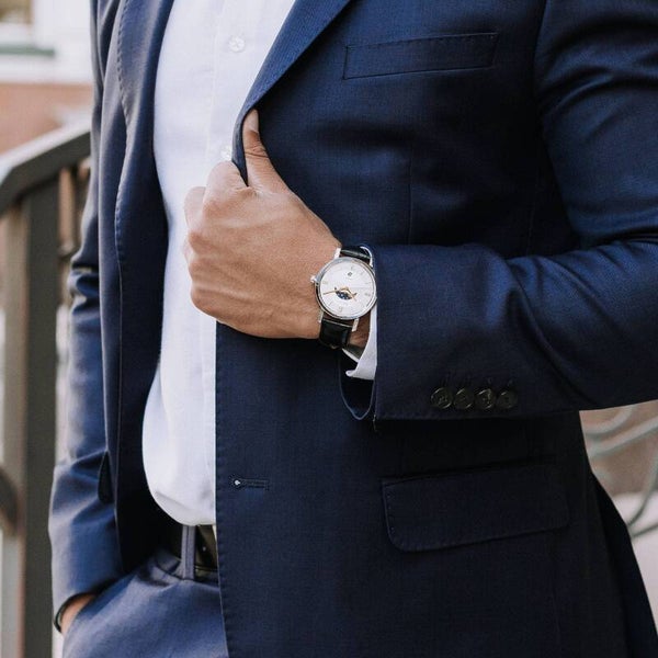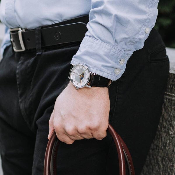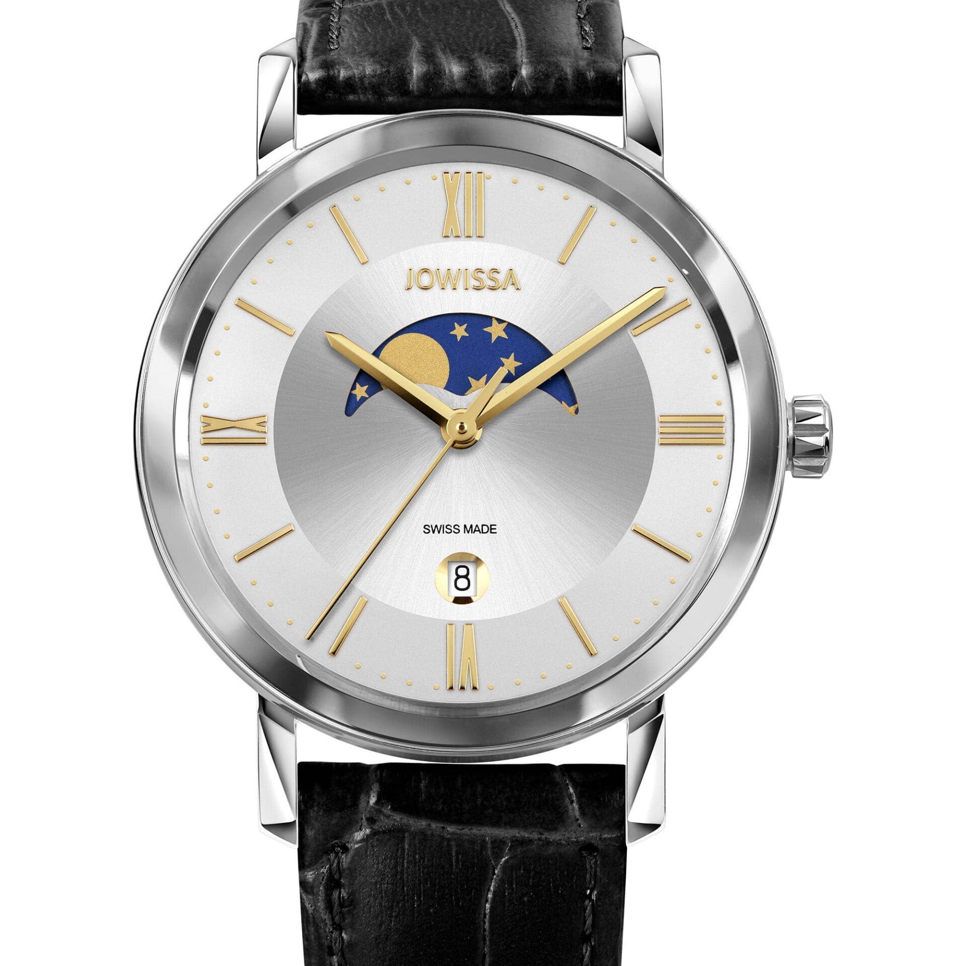 Este robusto reloj para hombre fabricado en Suiza es un reloj atractivo con un diámetro de 40 mm. Está confeccionado con una elegante esfera gris de rayos de sol detallada con una pantalla de fases lunares azules y doradas para crear una impresión sorprendente. El cristal duradero con un borde pulido es impresionante junto con una correa de piel de cocodrilo negra