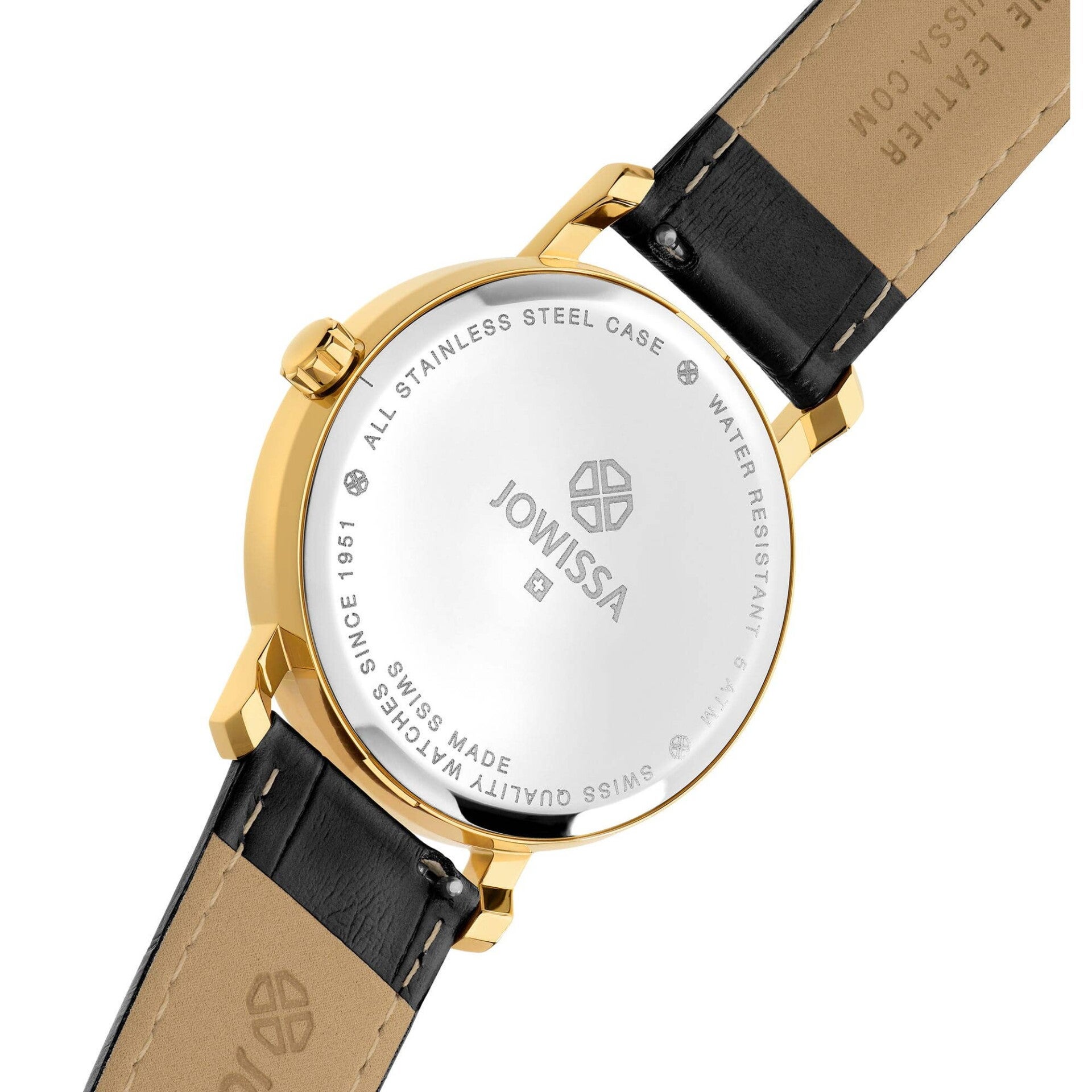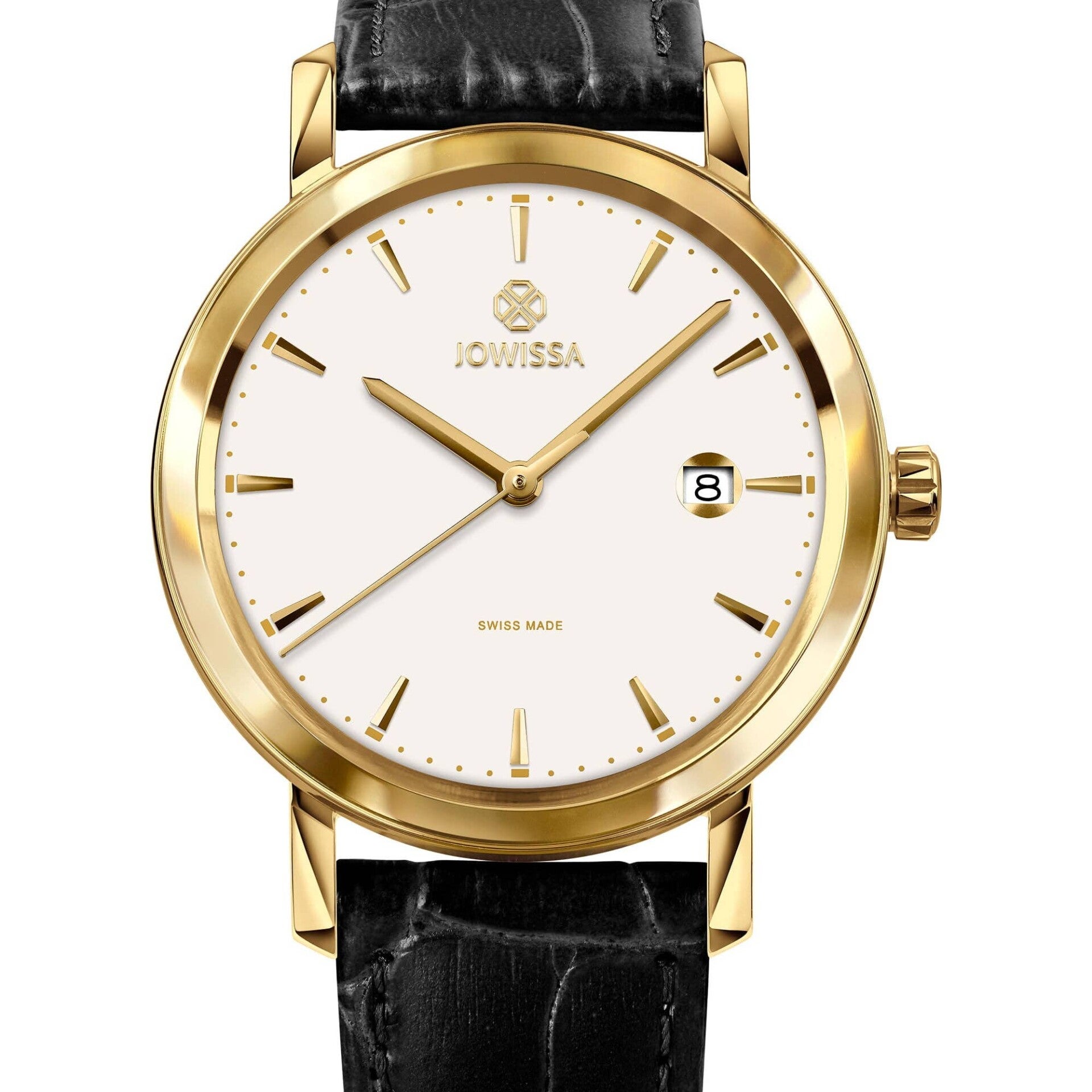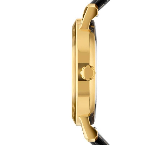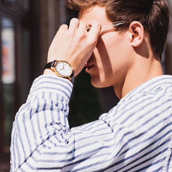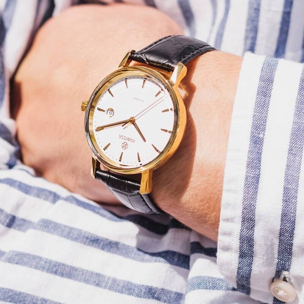 Este reloj de hombre dorado y blanco con caja de 40 mm queda bien con un traje o ropa casual. El contraste de color blanco y negro llama la atención. Una llamativa esfera blanca de rayos de sol se detalla con marcadores de hora y manecillas en tono dorado para darle a este reloj clásico un aspecto pulido. La correa de piel negra se adapta muy bien a la muñeca