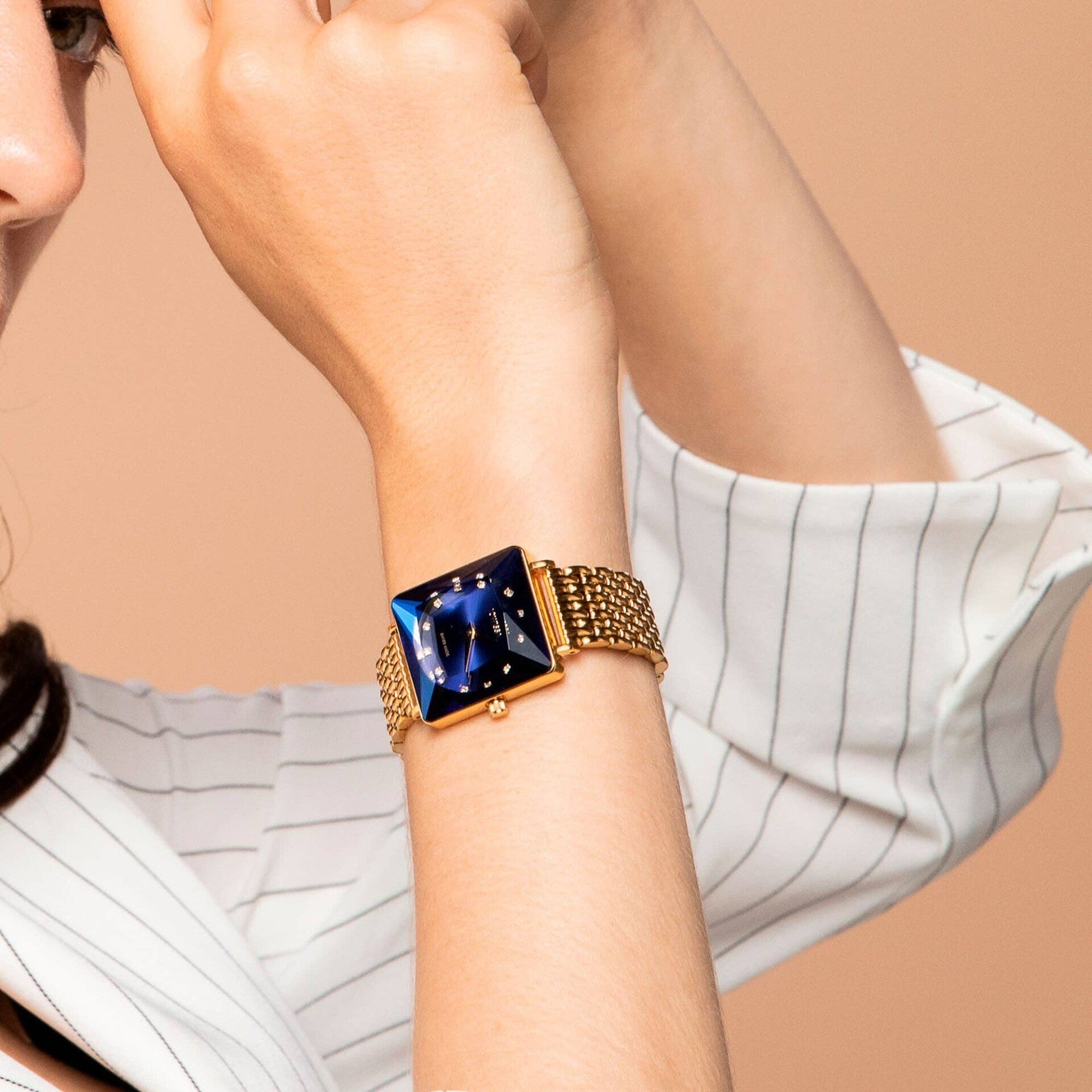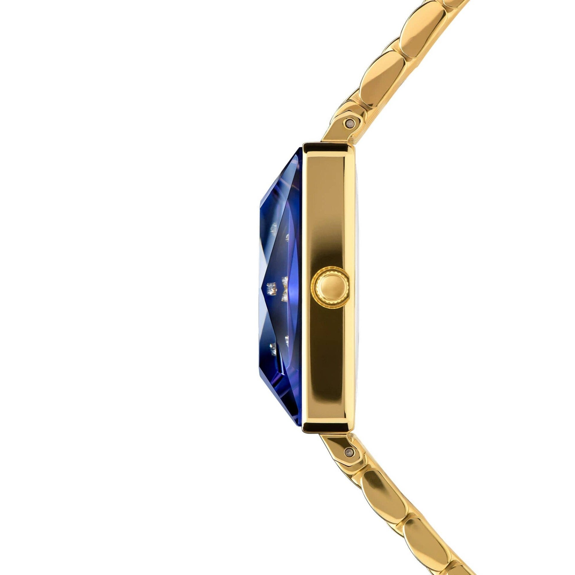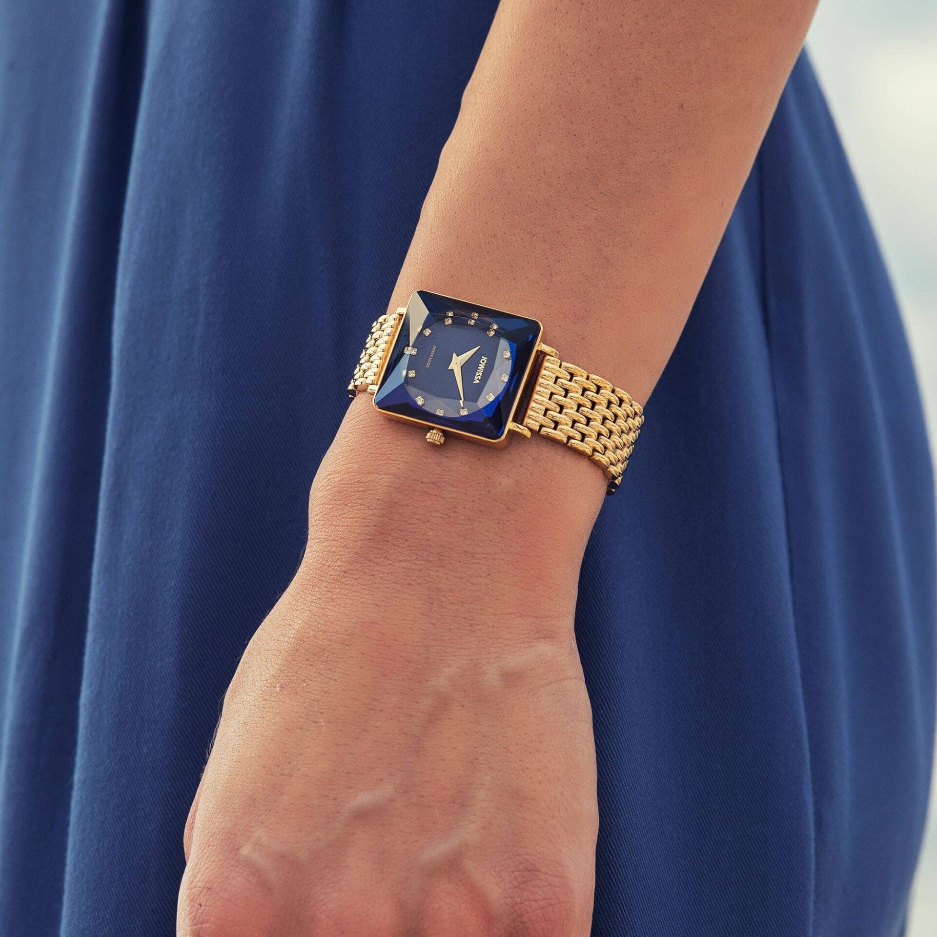 Este reloj cuadrado azul y dorado para mujer pertenece a la inolvidable colección Facet Princess. Inspirado en el corte princesa de diamante de forma cuadrada, el cristal del reloj brilla como una joya. La esfera redonda azul alberga una caja cuadrada de 25 mm. Un brazalete dorado también aporta una lujosa sensación de joyería a este reloj de mujer fabricado en Suiza
