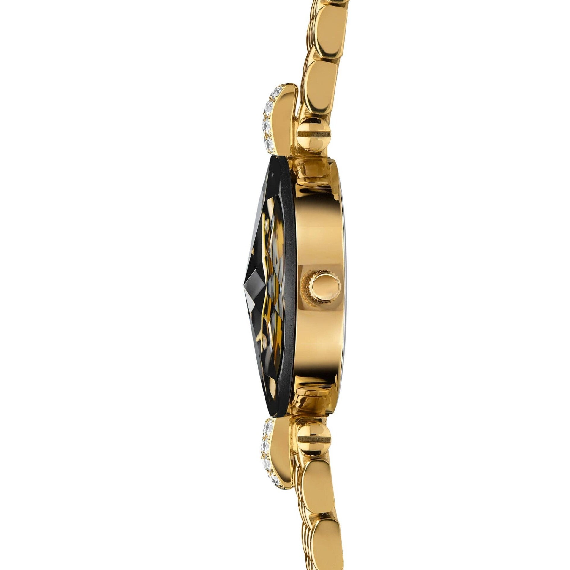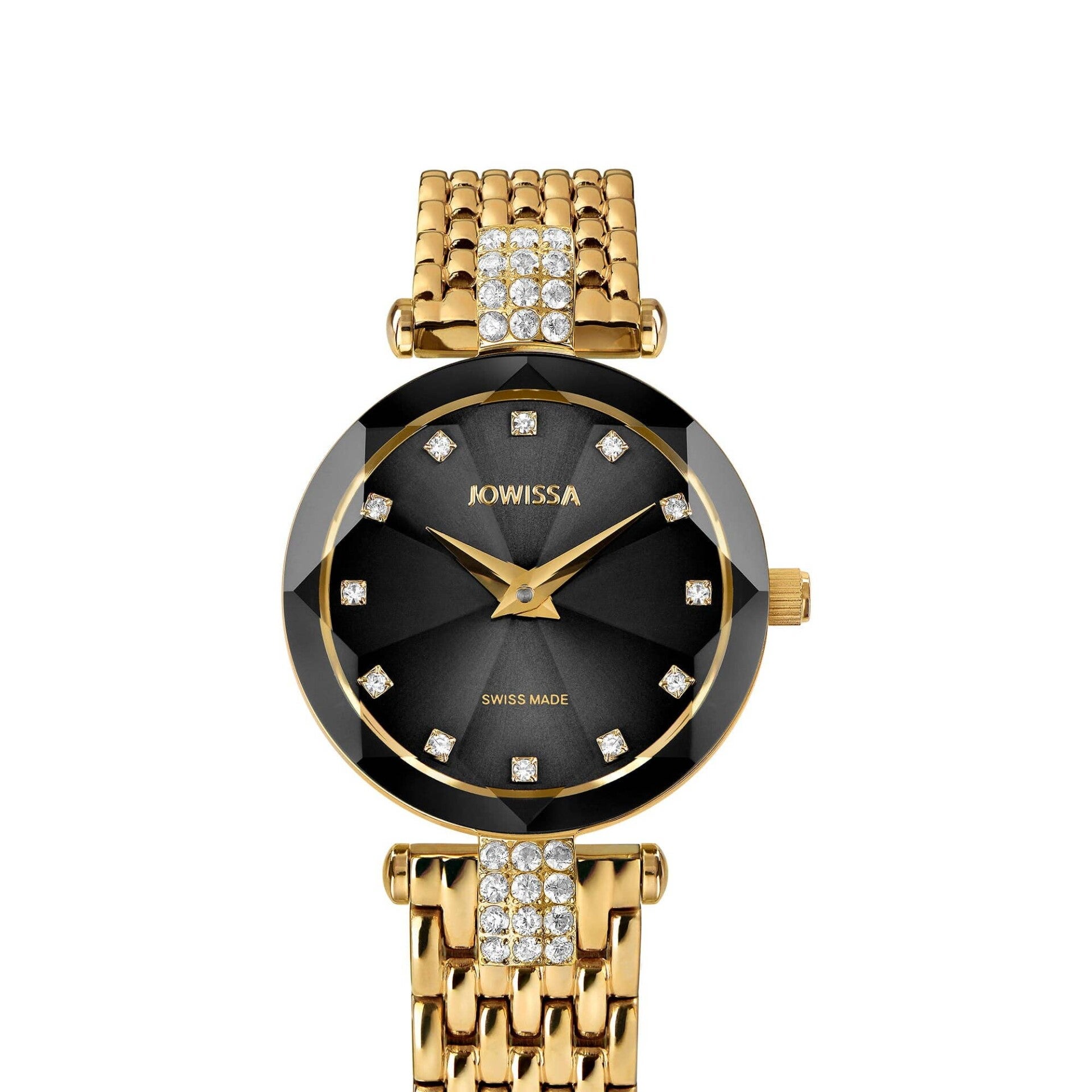 La elegancia moderna define un Strass Facet. Este reloj de mujer fabricado en Suiza con caja de 25 mm complementa tus glamurosos atuendos. Notará un cristal de talla diamante reflectante, brillantes piedras Strass, una esfera negra clásica de rayos de sol y una refinada banda de malla dorada. El diseño elegante y de alta calidad lo convierte en un reloj para atesorar