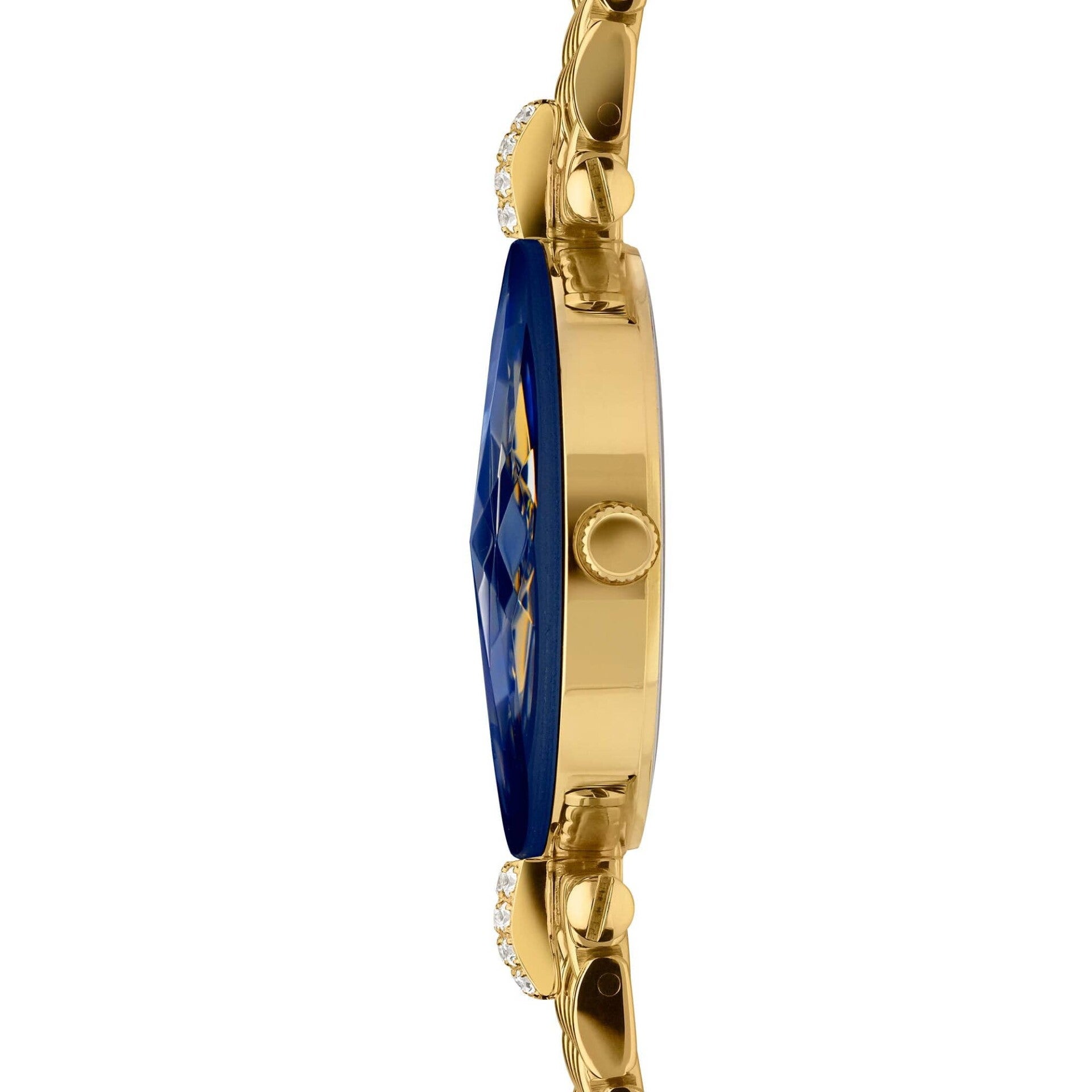 Este no es un reloj azul común y corriente. Es un reloj suizo único inspirado en el diseño de joyas. El Facet Strass tiene un diámetro de 30 mm y cuenta con una brillante esfera azul zafiro con efecto de rayos de sol. El cristal con corte de diamante y las brillantes piedras Strass captan la luz al igual que la pulsera de malla dorada. El accesorio ideal para mejorar tu estilo