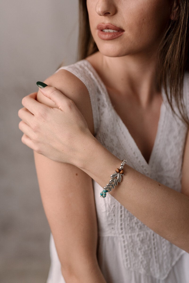 Pulsera de bolitas de Zamak (una aleación de zinc con aluminio, magnesio y cobre), madera y bolitas de pasta de cerámica turquesa.