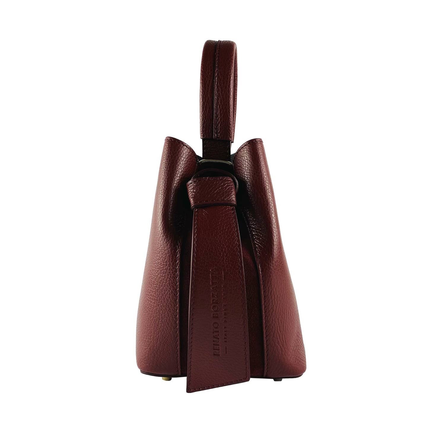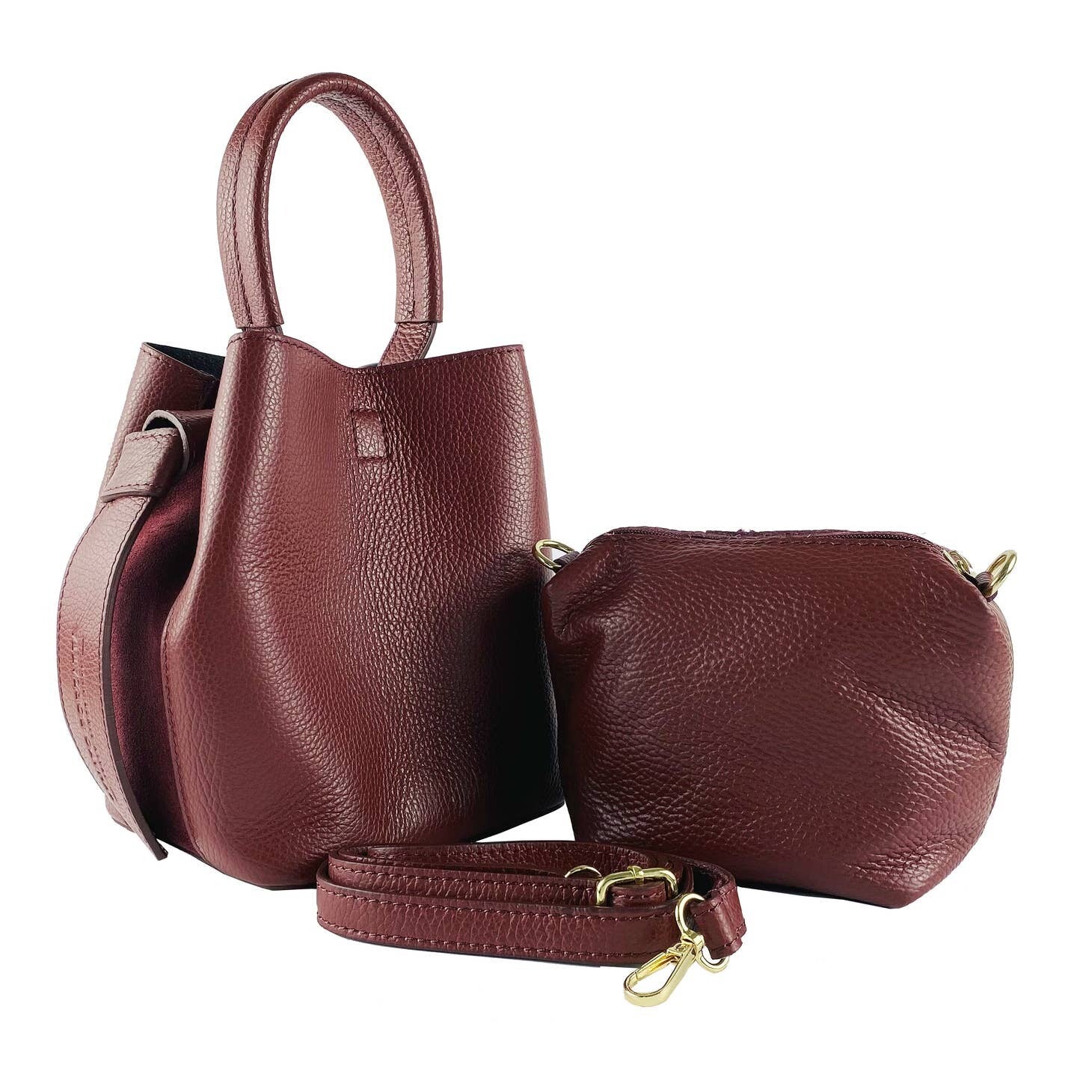 Cubo de piel auténtica burdeos con bolso de mano y correa para el hombro