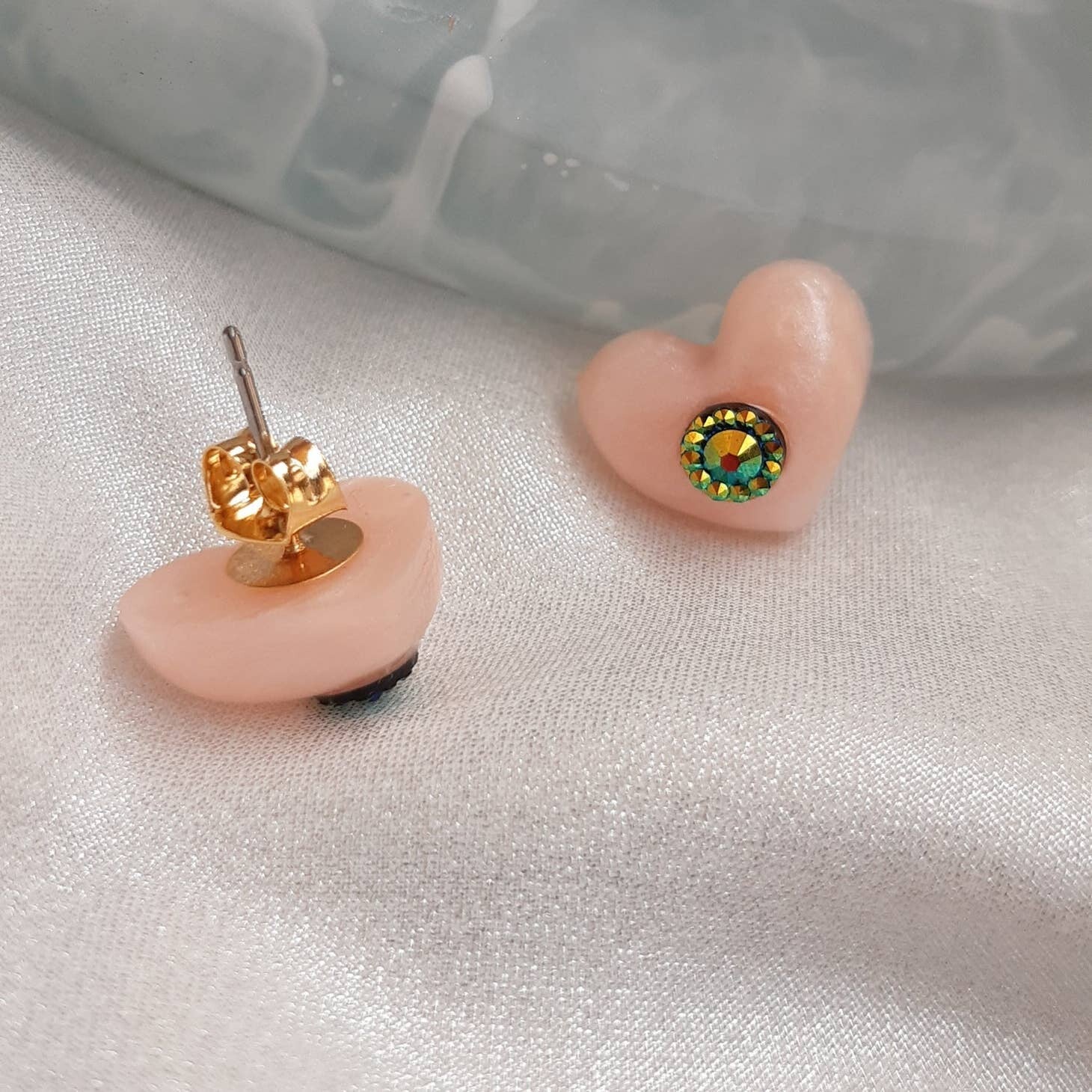 Estos son los pendientes más bonitos que te van a encantar. Estos pendientes están hechos a mano con los siguientes materiales: latón bañado en oro, cierre sin níquel y piezas de resina en forma de corazón nude con cristales negros. Hago todas las piezas de resina a mano una a una, en mi estudio y luego las perforadas con un taladro fino. Estos pendientes se venden como un par. Tamaño: 1,5 x 1,0 cm. 0,6 x 0,4 pulgadas.