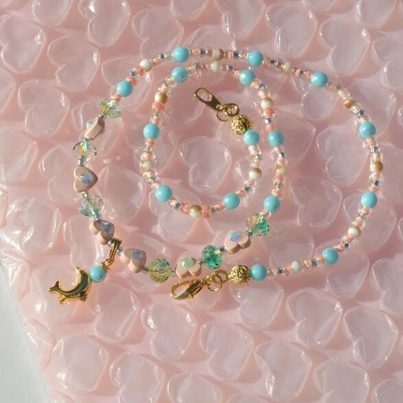 Bonito collar tipo gargantilla veraniego perfecto para el día a día. Este collar está hecho a mano con los siguientes materiales: colgante con forma de delfín de latón chapado en oro, cuentas de cristal azules, verdes y marrones, minicuentas en forma de corazón rosa claro con cristales y cuentas con semillas de cristal rosa y azul.