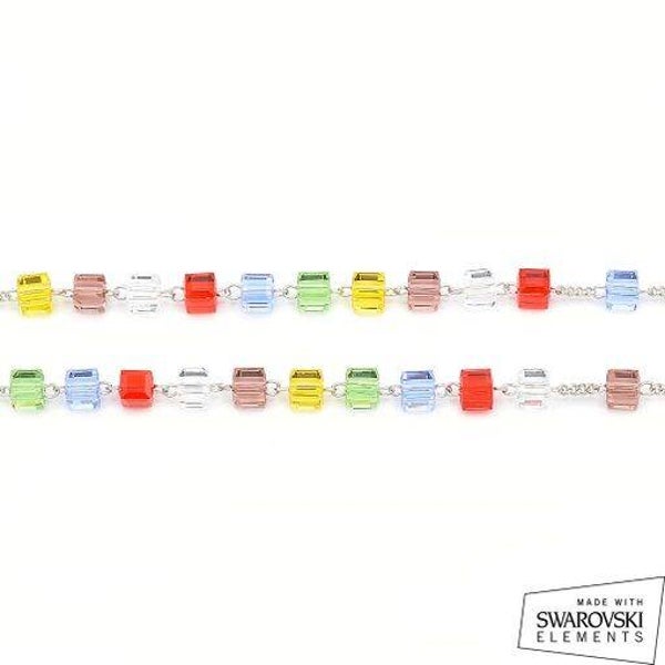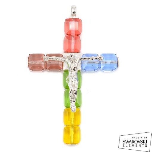 Cuentas cubo facetadas de cristal Swarovski® de 6 mm Alambre de plata de ley de 0,60 mm, chapado en rodio grueso, cadena «Gourmette» de corte diamante 925/°, plata de ley 925/°, chapado en rodio de 0,50 mm de espesor, tuercas de anillo de placa de la marca en aleación de zamak. Centro de mesa hecho a mano con cuentas cúbicas de Swarovski® de 6 mm colocadas a mano sobre una estructura de plata de ley 925/° con baño de rodio grueso, en el centro reproducción de la aparición de Lourdes en plata de ley 925/°° con baño de rodio grueso. Crucifijo hecho a mano con cuentas cúbicas de Swarovski® de 6 mm colocadas a mano sobre una estructura de plata de ley 925/° con baño de rodio grueso, en el cuerpo central de Jesús en plata de ley 925, baño de rodio grueso.