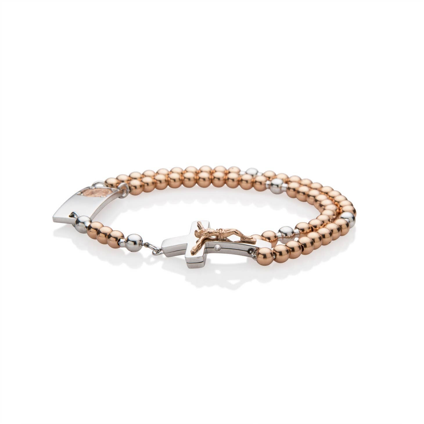 Por primera vez, Ghirelli ha creado un rosario completo que se puede llevar como una fina pieza de joyería fina. El Magnificat ROSALET® en metales preciosos con un diseño y tecnología de cierre patentados dentro de cada cruz/crucifijo, no se parece a ningún rosario o pulsera que haya existido antes. En todo, el rosario busca magnificar el amor, así como el alma de Nuestra Señora magnifica el amor de su Hijo. Este nuevo diseño creativo te permite llevar tu rosario para que nunca te quedes sin él. Las cuentas chapadas en plata de ley y oro rosa se mueven perfectamente a lo largo de la cadena cuando se usan en oración. El Magnificat ROSALET® proporciona una cadena de rosas a través de la oración que llega hasta el cielo y se manifiesta en un vínculo espiritual con Dios, la comunión de los santos y la Reina del Cielo.