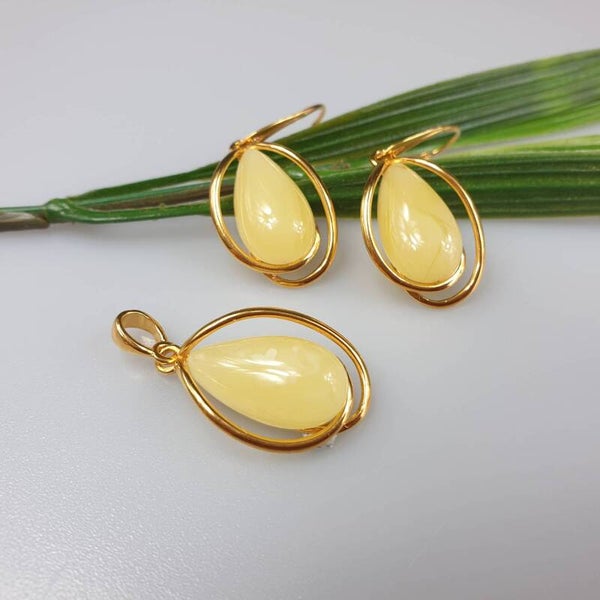 Pendientes de ámbar báltico auténtico. Longitud de unos 4 cm. Cierre trasero con palanca. Todas las piezas son de plata de ley 925 chapada en oro. Set de colgantes y pendientes.