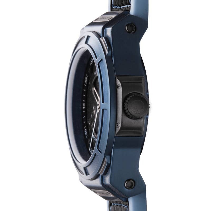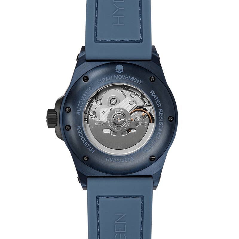 Este estilo Otto presenta un movimiento Day-Date Made in Japan en una caja de acero inoxidable macizo con baño iónico azul de 40 mm. Un tono azul metálico de la esfera inferior y la pista de acero negro en capas le dan a este reloj Hydrogen un estilo de prestigio que viene con 10 ATM.