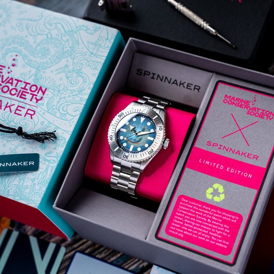 Spinnaker SPENCE 300 AUTOMATIC MCS EDICIÓN LIMITADA (SP-5124-11) es un reloj para hombre con un movimiento automático japonés de 3 manecillas y fecha. Su caja redonda de acero inoxidable y brazalete con detalles azules le dan un toque elegante. Incluye una correa adicional de la OTAN y tiene una resistencia al agua de 30 cajeros automáticos. El cristal de zafiro con tratamiento antirreflectante asegura una legibilidad óptima.