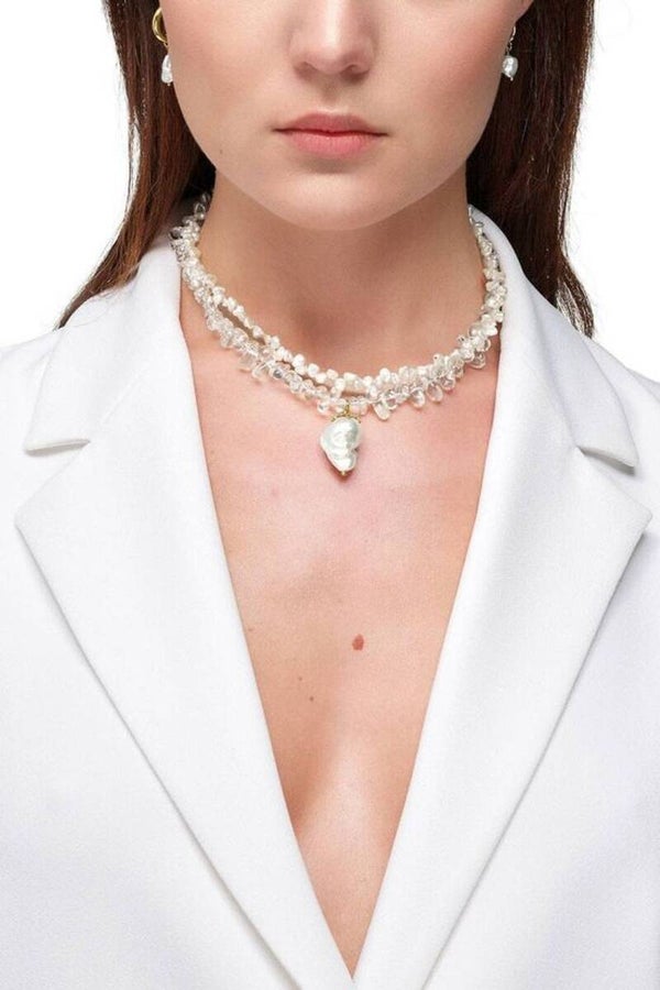 Está elaborado con dos hilos distintos: uno de perlas diminutas y otro con bolitas de cuarzo cristal de roca. El colgante de perla está rematado con un elemento chapado en oro.