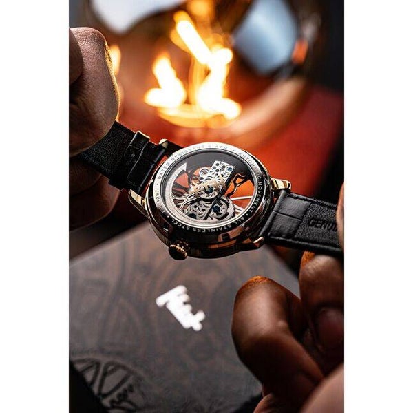 EARNSHAW Cornwall Bridge Automático ES-8287-03, un reloj para hombre con movimiento automático de 2 manecillas. Caja redonda de acero inoxidable en tono dorado y esfera esqueleto en tono dorado. Correa de cuero genuino negro. Diámetro de caja de 42 mm. Resistencia al agua de 5 ATM. No solo un reloj, es una inversión en estilo y durabilidad.