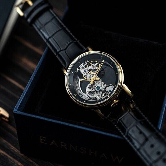 EARNSHAW Fowler Bridge Skeleton Automatic ES-8225-04, un reloj para hombre con movimiento automático esqueleto de dos manecillas. Caja redonda de acero inoxidable en tono dorado y esfera esqueleto negra. Correa de cuero genuino negro. Diámetro de caja de 43 mm. Resistencia al agua de 3 ATM. Un reloj de estilo y durabilidad para el hombre moderno.