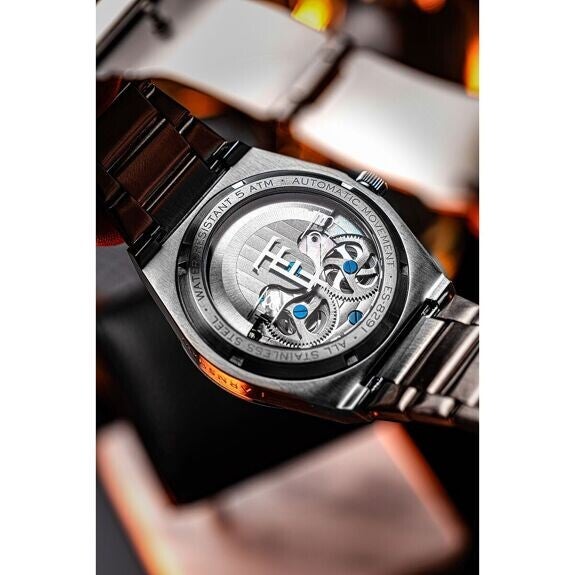 Reloj EARNSHAW para hombre, con movimiento automático esqueleto multifunción y zona horaria dual. Caja redonda de acero inoxidable plateada con bisel en tono oro rosa y esfera esqueleto gris. Brazalete de acero inoxidable plateado. Diámetro de caja de 43 mm. Resistencia al agua de 5 ATM. Un reloj de estilo y durabilidad para el hombre moderno.