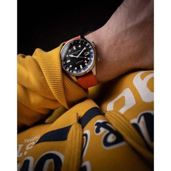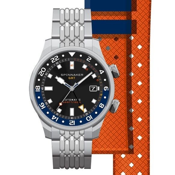 SPINNAKER - Bradner GMT- SP-5121-66 - Reloj para hombre - Movimiento GMT - Caja redonda de acero inoxidable plateada - 2 coronas - Esfera negra con bisel giratorio interior negro y azul y números en relieve - Correa de piel de acero inoxidable plateada con pulsera adicional de silicona naranja