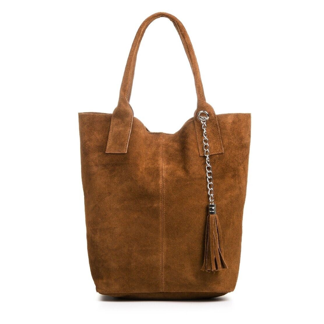 Bolso de piel acabado Camoscio. Compartimento principal con cierre por corchete magnético. Interior en piel vuelta. Dispone de bolsillo auxiliar con cierre por cremallera unido al bolso mediante cadena metálica y borla decorativa con flecos. Acabado: Sin acabado; Asa: 19; Correa: NO; Material: Gamuza, Cuero; Color: Marrón