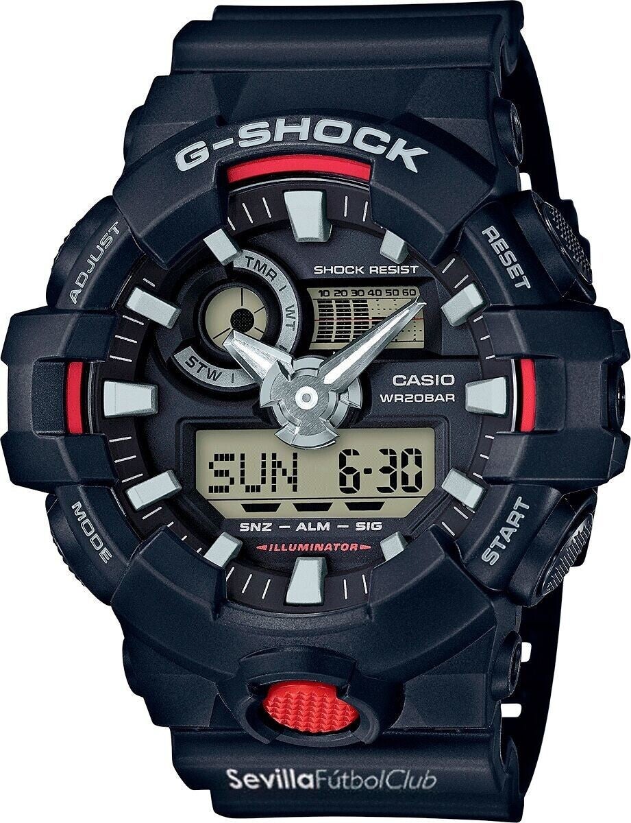Reloj Casio GA-700SFC-1A: El compañero perfecto para el hombre activo. Este reloj de cuarzo combina un display analógico/digital con una caja y correa de resina blanca, ofreciendo durabilidad y estilo. Su esfera gris y cristal mineral aseguran una apariencia sofisticada. Con funciones como alarma, iluminación, cronómetro, temporizador y resistencia al agua de 20ATM, es ideal para cualquier aventura. Además, muestra tu apoyo al Sevilla Fútbol Club con orgullo. ¡No te pierdas este G-SHOCK único! ⚽⌚