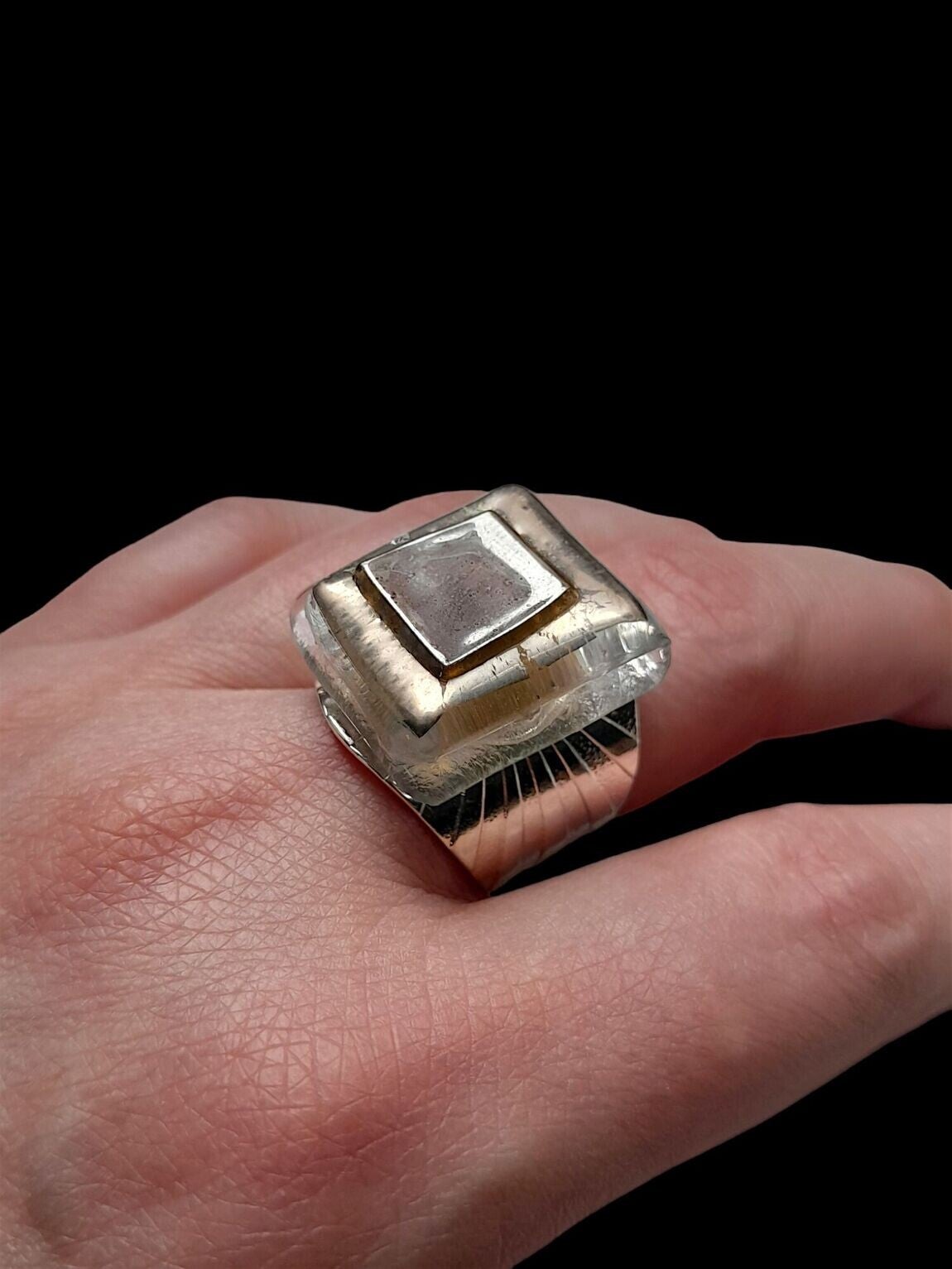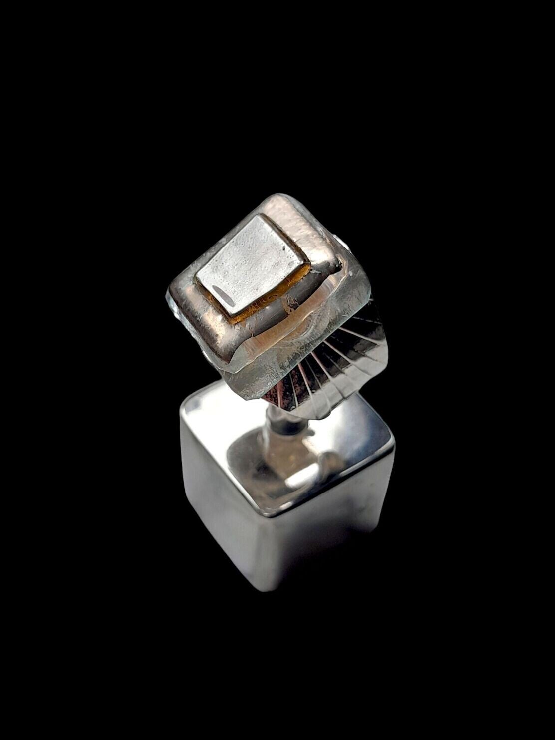 El Cabujón de cristal con reflejos plateados que brillan como un espejo, tiene una base cuadrada (2cm x 2 cm), nos sorprende por su composición geométrica con colores cambiantes, iridiscentes y reflejos luminiscentes. Pieza única.