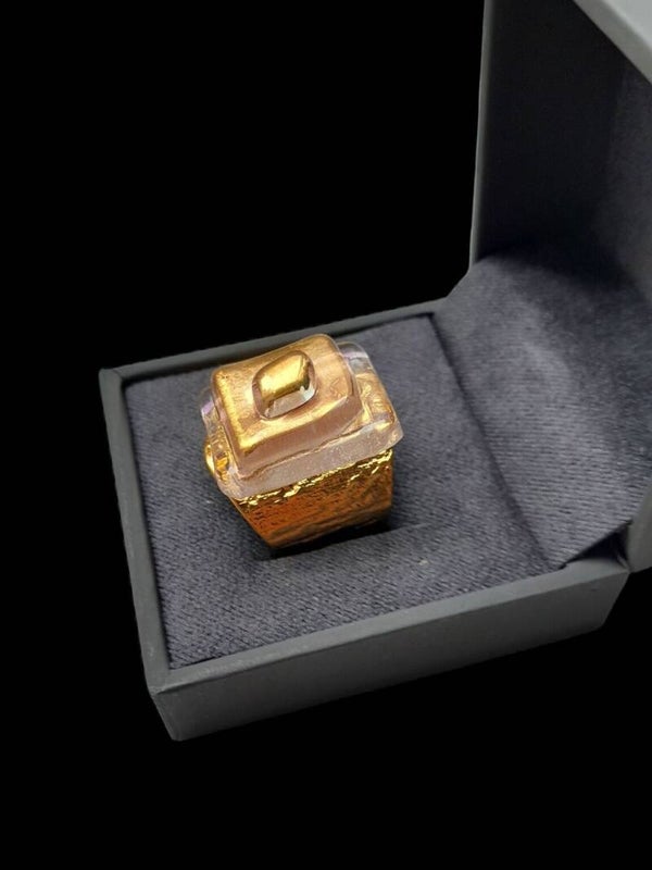 Este deslumbrante anillo dorado, con capas de brillantes cristales de vidrio, realzará cualquier conjunto con su espectáculo de luces cautivador. Fabricado en latón texturizado y bañado en Oro de 24 quilates, su tamaño ajustable garantiza un ajuste perfecto y cómodo. Cada pieza es única, lo que añade un toque exclusivo a tu joyero. ¡Hazlo tuyo y brilla con estilo!