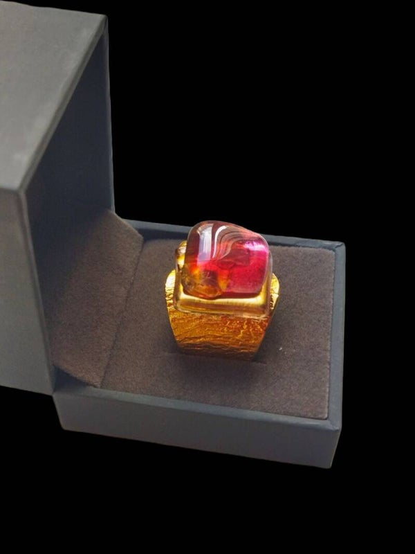 Presentamos Rose à l’Or, el vidrio soplado antiguo más prestigioso, enriquecido con rubíes y rosas obtenidos mediante cloruro de oro. Cada anillo es una obra de arte artesanal, con un cabujón de rubí y cristal irisado, soldado sobre una anilla de latón martillado y bañada en oro de 24 quilates, ajustable a tu dedo.