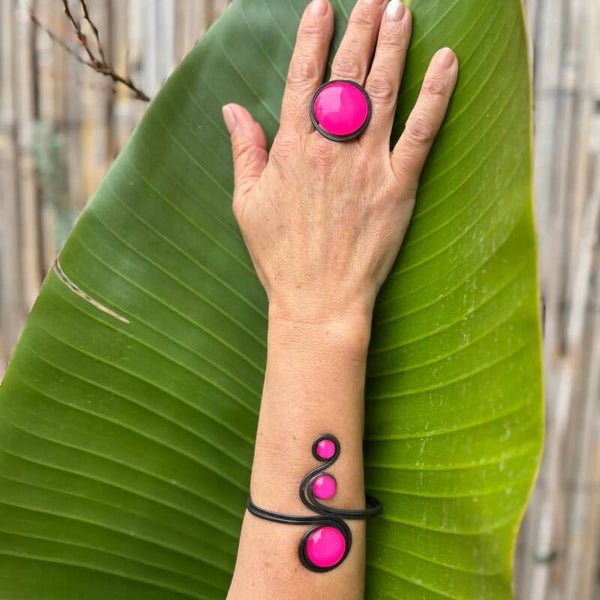 Haz brillar tu personalidad con el vibrante anillo "Sol Fucsia", diseñado con pasión y precisión. Elaborado con vidrio fundido y hierro forjado, esta pieza única combina arte moderno con un carácter deslumbrante. 🌟