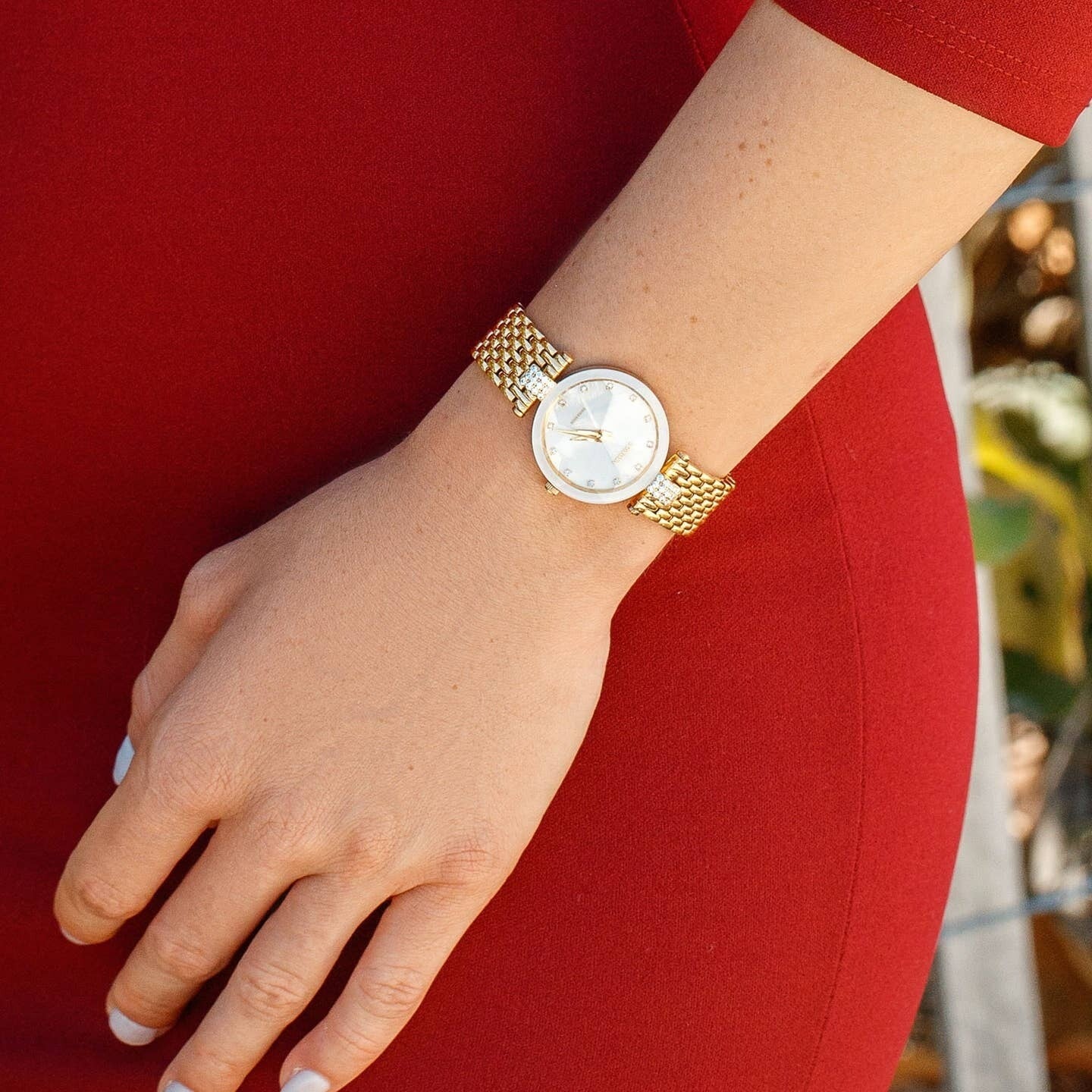 💎 El reloj suizo Jowissa Facet Strass J5.633.M es una pieza elegante para mujer, que destaca por su movimiento de cuarzo Ronda, caja de acero inoxidable chapada en oro y cristal mineral facetado con efecto diamante. Su esfera de madre perla incluye 12 cristales strass como indicadores de hora, acompañada de manecillas tipo joya y una pulsera dorada intercambiable. Con un diámetro de 29.5 mm y resistencia al agua de 5 ATM, es ideal para quienes buscan lujo, estilo y precisión en una sola pieza.