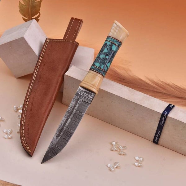 Cuchillo de acero damasco con mango de hueso de 10' con funda de cuero.