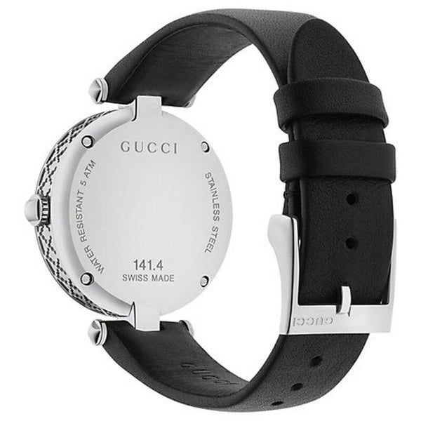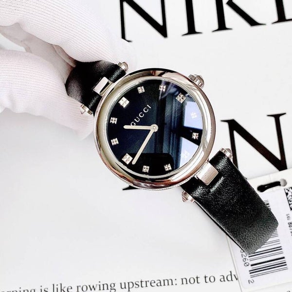 El reloj Gucci Diamantissima Diamonds para mujer combina la elegancia atemporal con el diseño distintivo de la casa italiana. Su esfera negra profunda, sin marcadores visibles, realza la pureza estética del modelo, mientras que la caja en acero inoxidable con acabado PVD negro incorpora el icónico patrón diamantado grabado, símbolo de sofisticación discreta.