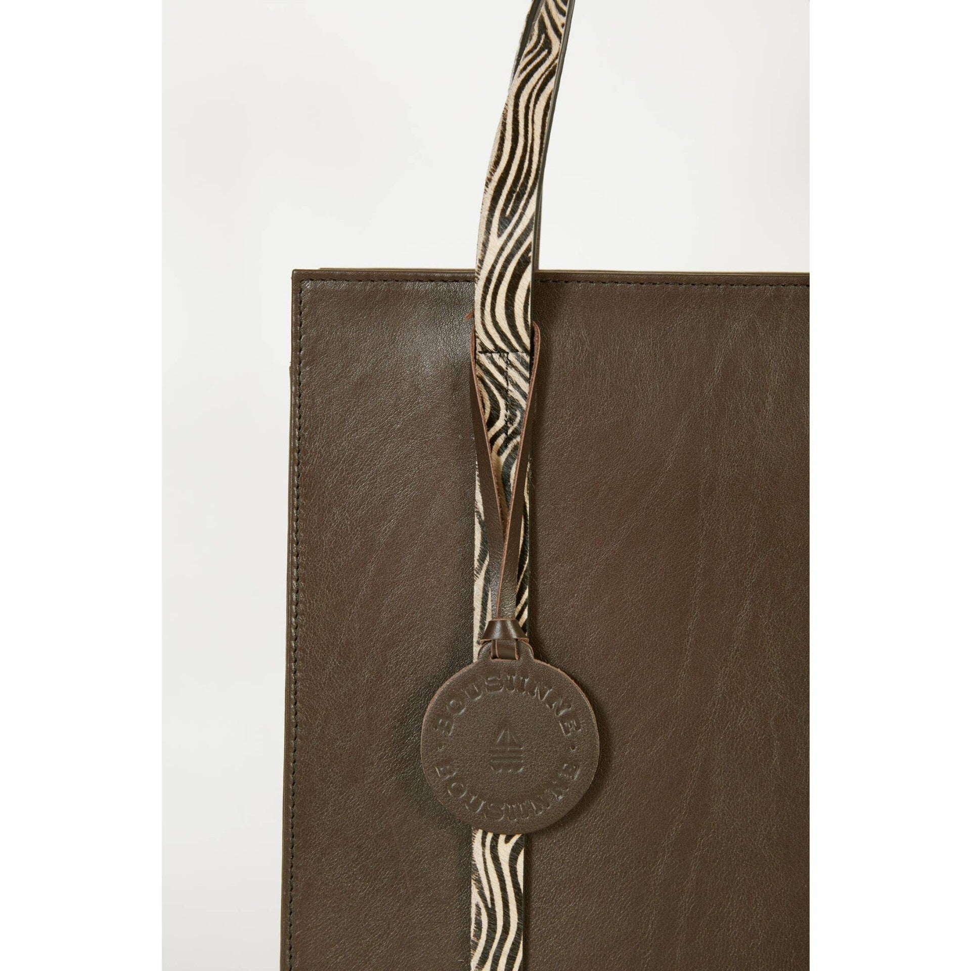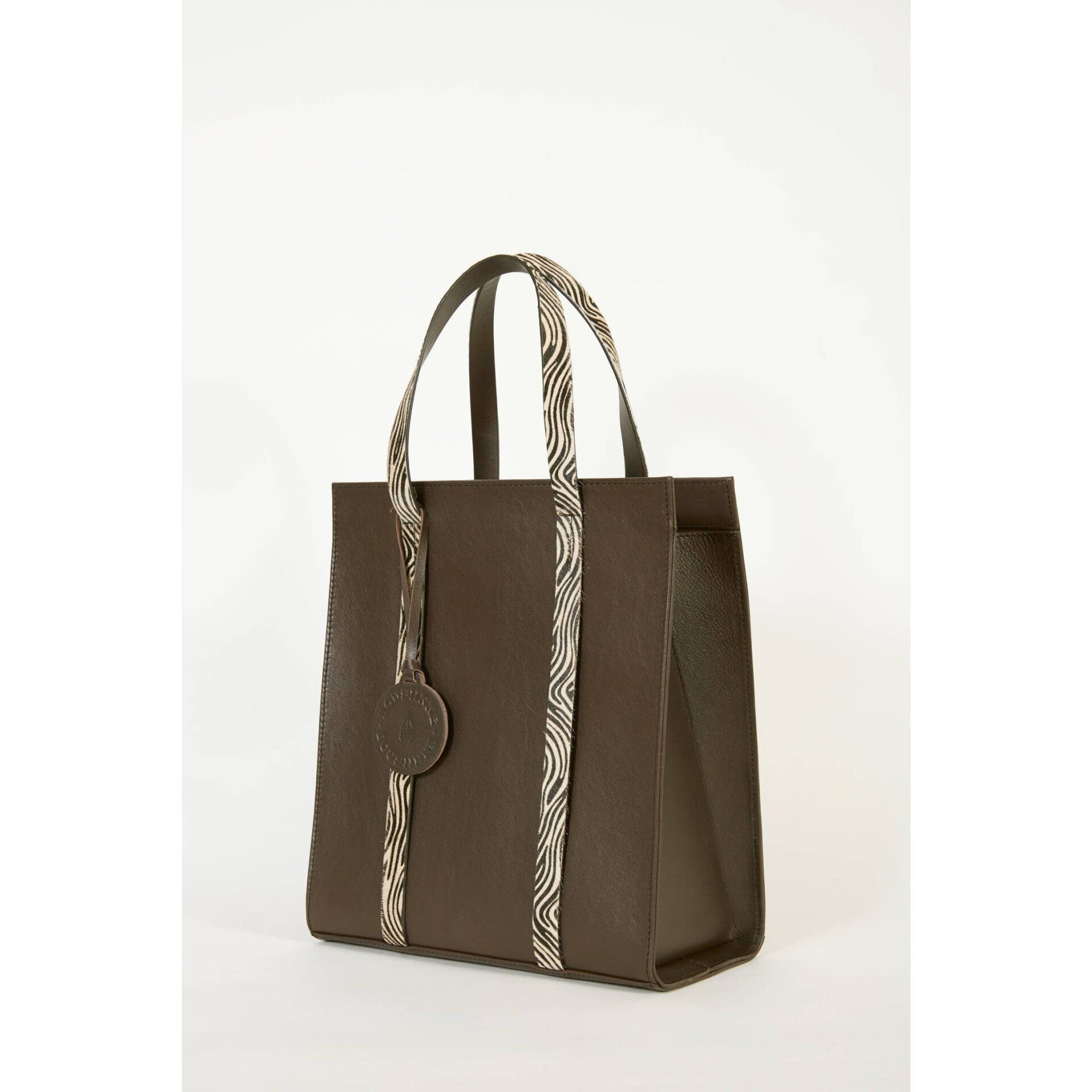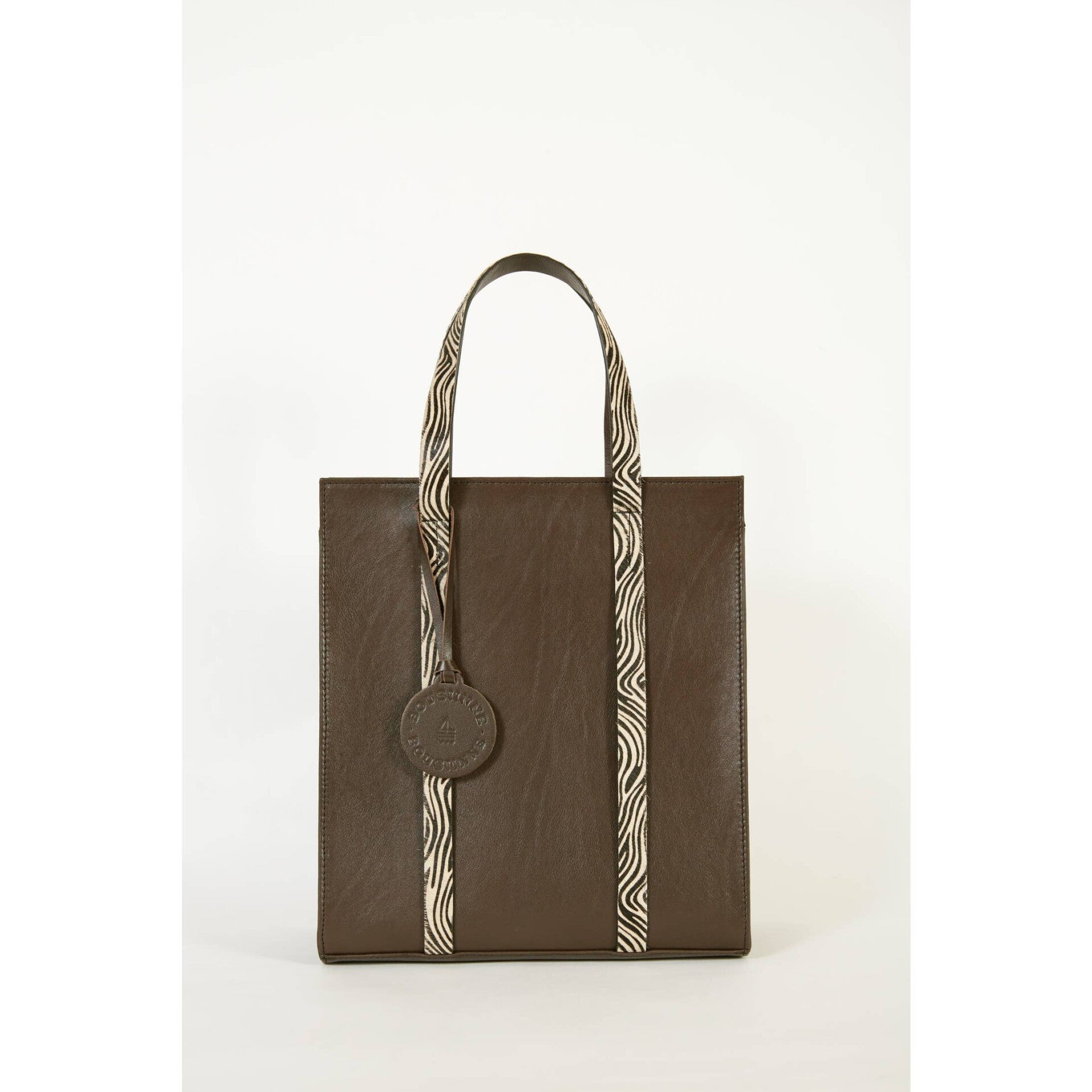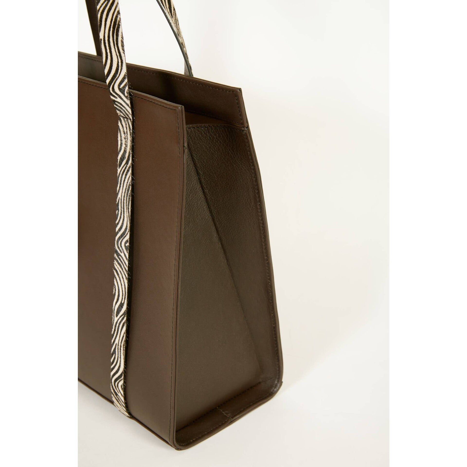Bolso shopper de piel de vacuno color marrón contraste con asas de pelo con estampado de cebra.