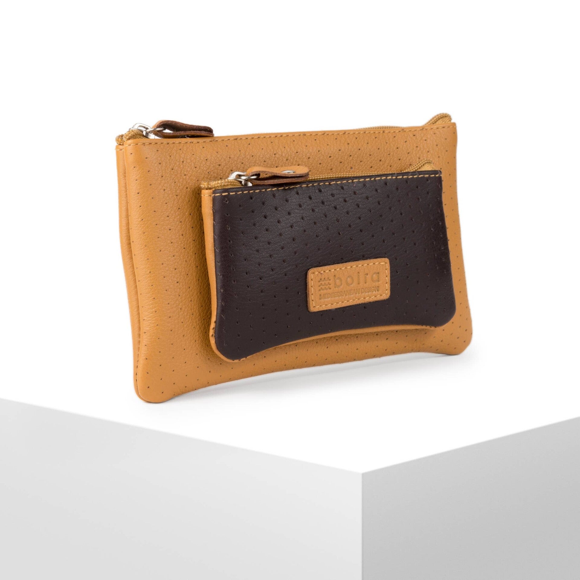 Monedero de piel hecho a mano con doble compartimento.